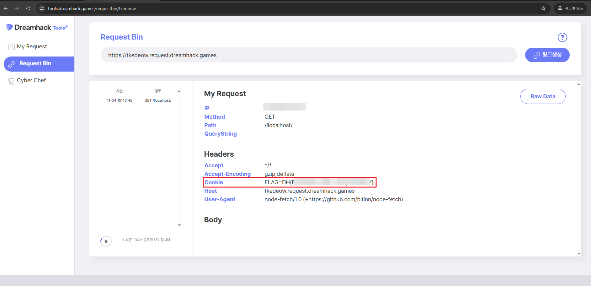 - 이제 리퀘스트빈으로 가보면 요청 패킷의 헤더(Cookie)에 플래그가 찍힌 걸 확인할 수 있습니다.