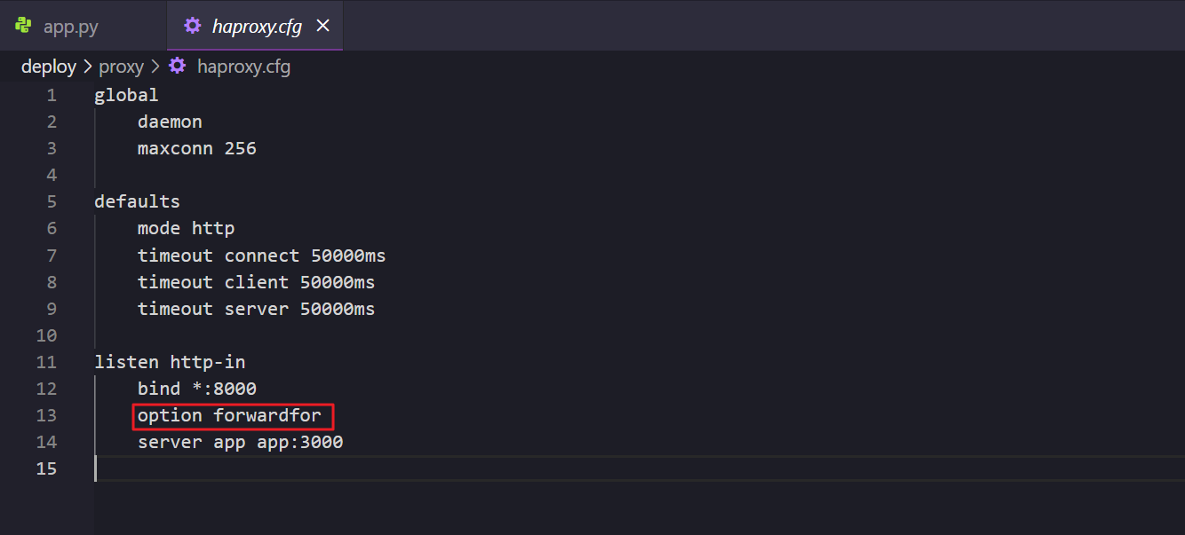 app:3000) 입장에서는 모든 요청이 HAProxy에서 오는 것처럼 보인다. haproxy.cfg파일을 살펴보면 서버로 들어오는 http 트래픽에 대하여forwardfor옵션이 있는데 HAProxy가 클라이언트의 실제 IP 주소를 백엔드 서버로 전달하기 위해 사용하는 설정이다.