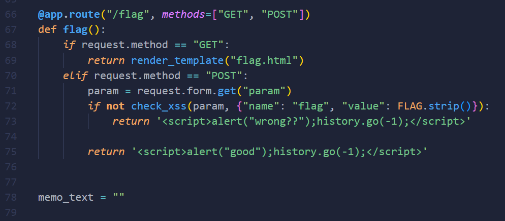 check_xss함수가 호출되는데요. check_xss함수가 호출될 때, 2번째 인자를 보면 플래그(FLAG.strip()) 값이 함께 전달됩니다.