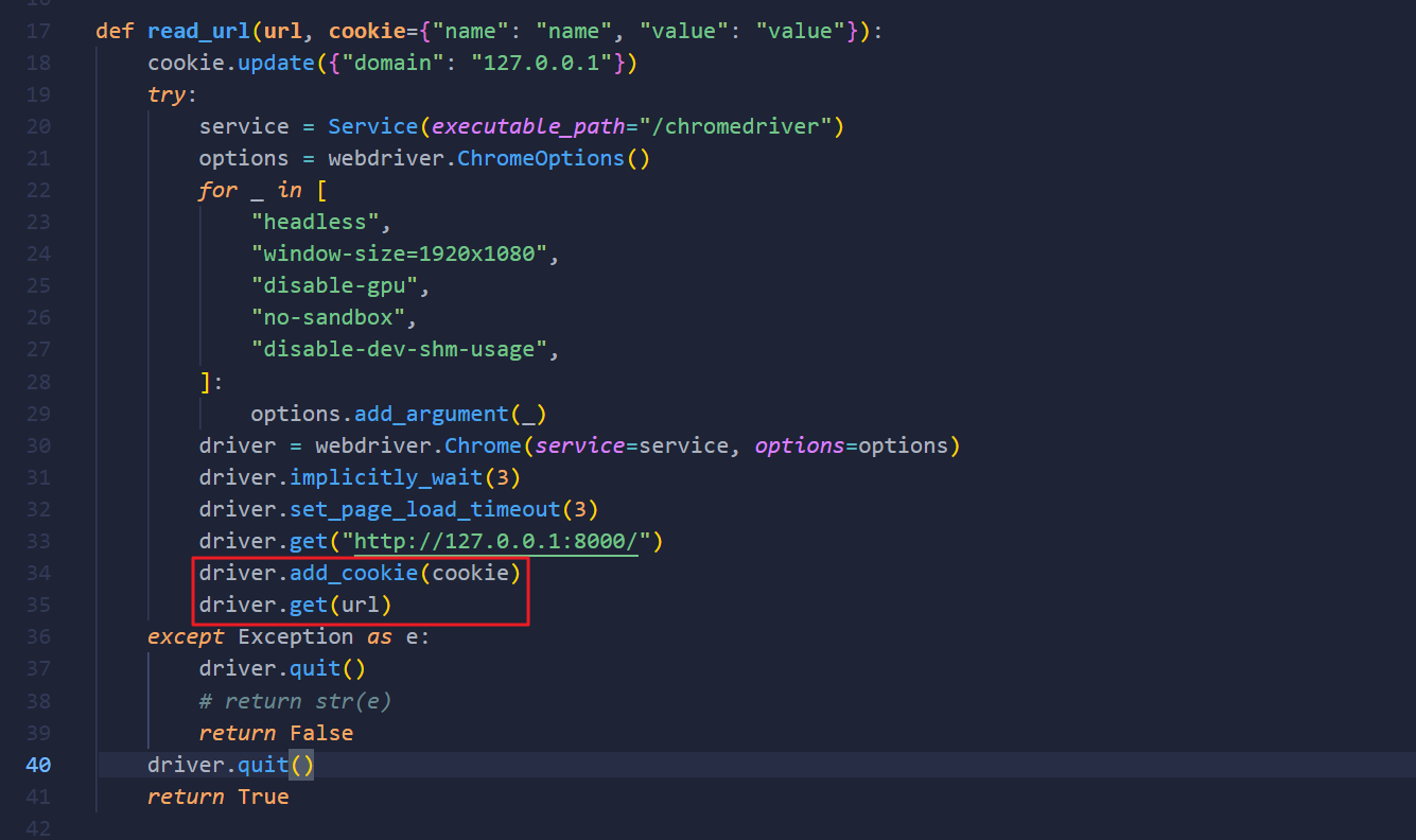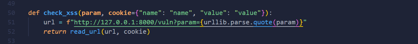 cookie값은{'name': 'flag', 'value': FLAG.strip(), 'domain', '127.0.0.1'}이고, 35라인에서 사용된url값은http://127.0.0.1:8000/vuln?param={urllib.parse.quote(param)}가 됩니다.