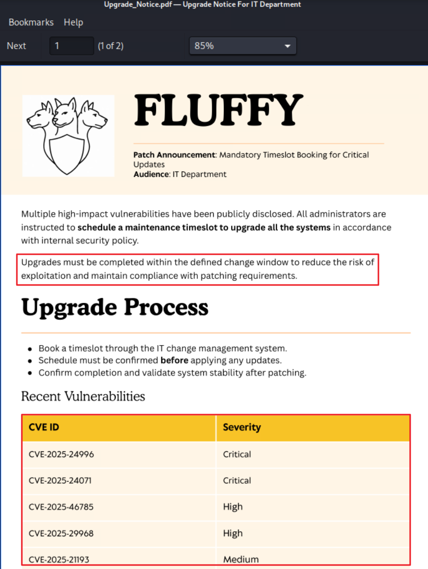 SMB 10.129.203.70 445 DC01 SYSVOL READ Logon server shareIT쉐어의Upgrade_Notice.pdf파일을 다운로드 하여 내용을 확인하니,- 영향도가 높은 다수의 취약점을 패치(업그레이드)하라는 공지였다.