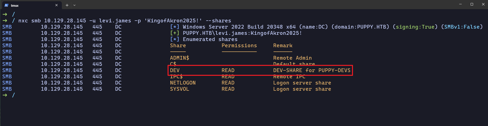 SMB 10.129.28.145 445 DC DEV DEV-SHARE for PUPPY-DEVS