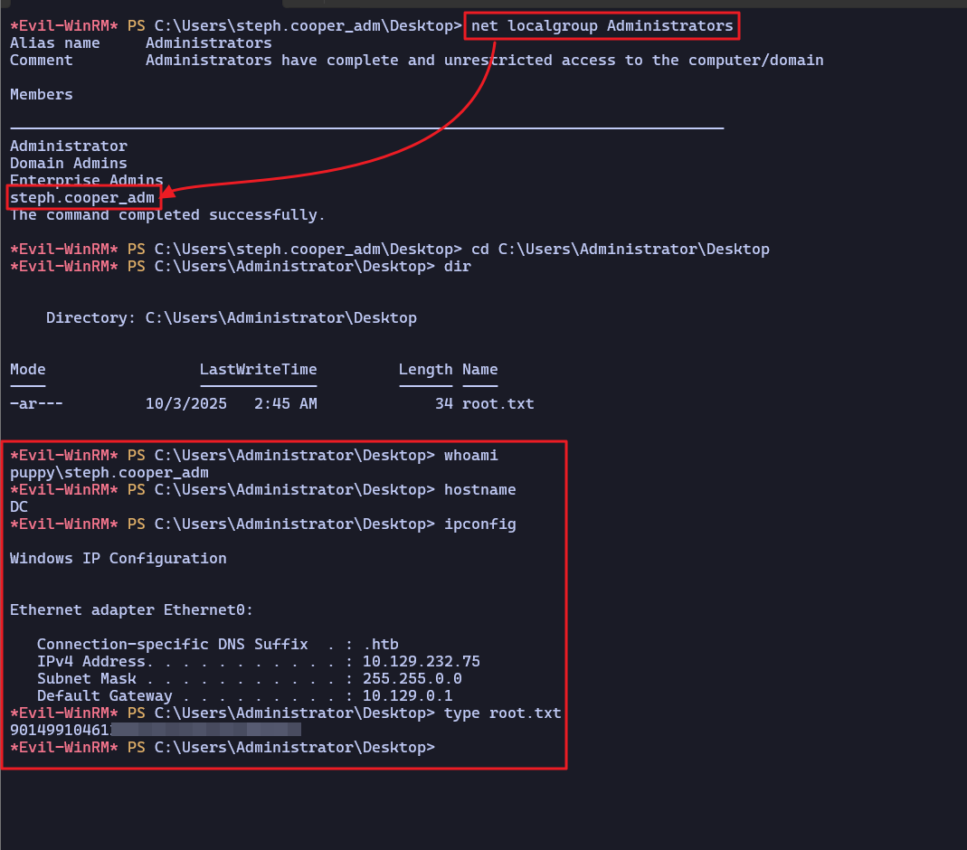 steph.cooper계정은 로컬 관리자 그룹에 속해 있어 별도 권한상승 없이 루트 플래그 확인이 가능했다.