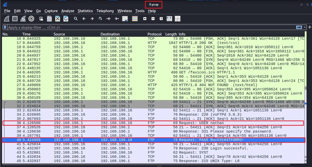 0.pcap 파일로부터 FTP 접속에 사용된 평문 계정정보를 확인할 수 있다.
