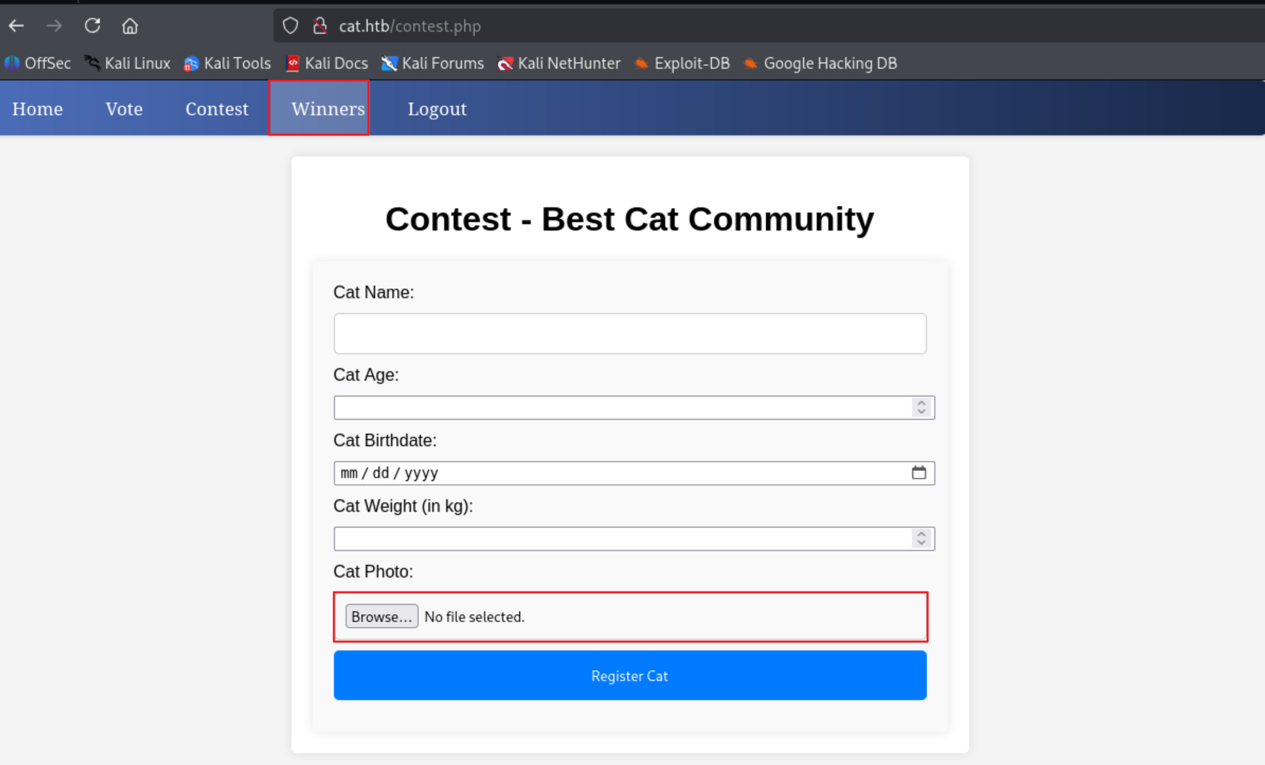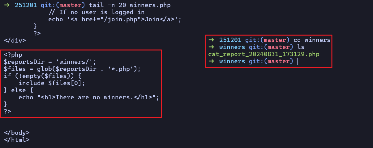 winner.php파일 내용을 살펴 보니,include함수로/winners/*.php파일을 불러와 화면에 출력하고 있었다.- 현재 /winners 경로에는 “cat_report_20240831_173129.php” 파일만 존재했다.