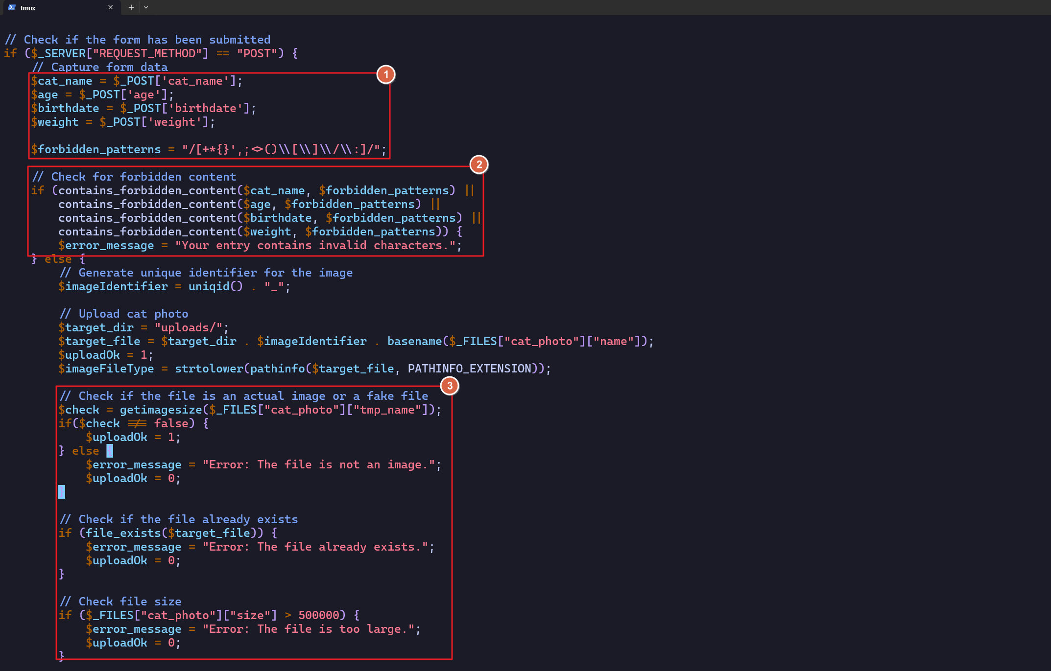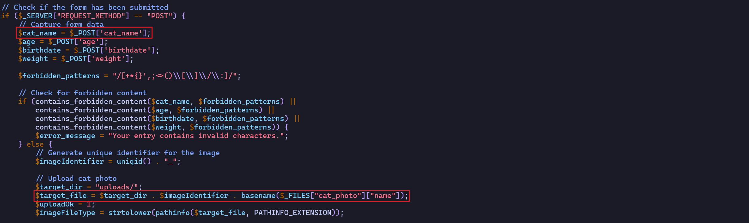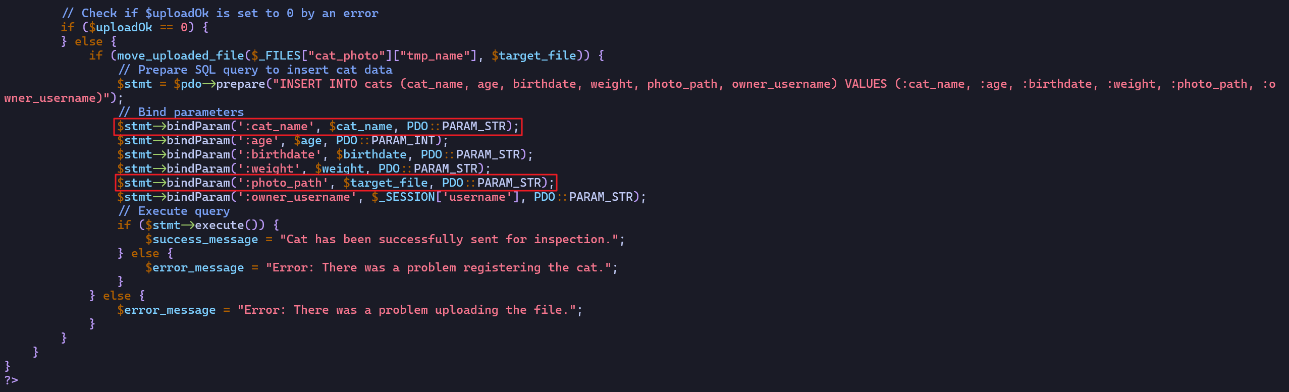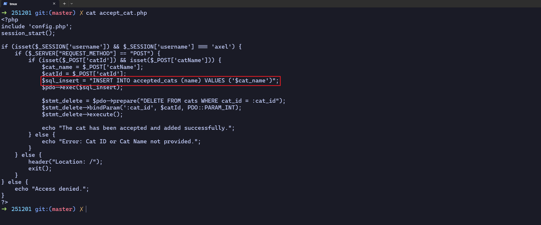 accept_cat.php파일에서는$sql_insert변수에 할당된 SQL 쿼리문이 선처리 질의문(바인딩 X)이 아니기 때문에 임의의 코드를 주입하여 DB에서 실행되도록 유도할 수 있다. (SQLi 취약구간)