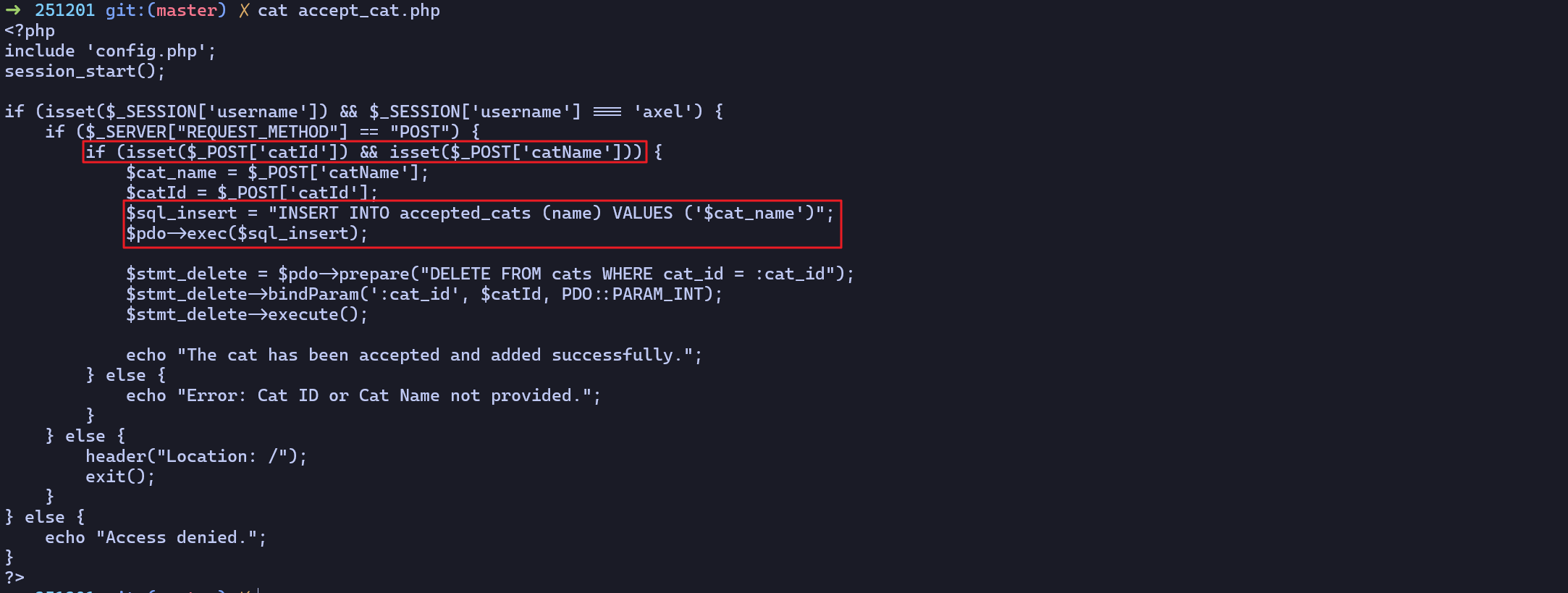 accept_cat.php파일에서 SQLi 취약 지점을 발견했다.- 그러나, 해당 소스도 관리자만 사용할 수 있는 기능이었기 때문에 취약점 연계 공격이 필요했다.