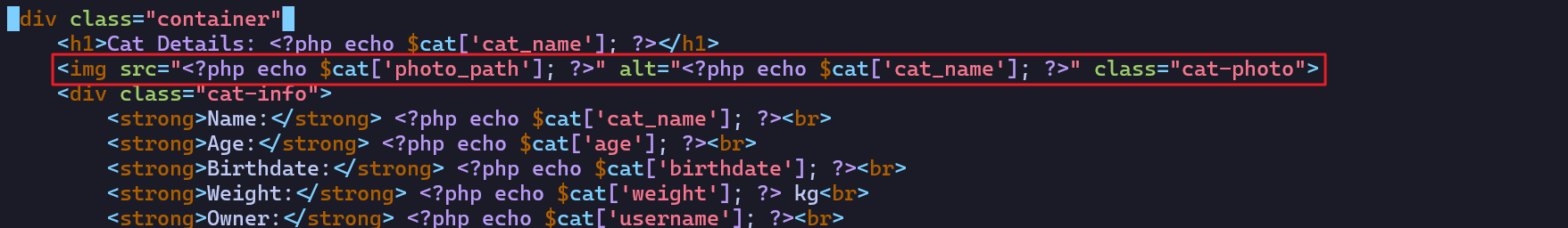 view.php파일에서는 이미지 태그를 통해 고양이 이미지 경로/고양이 이름을 불러와 화면에 출력하는 구조를 띠고 있다. 이 때,$cat['photo_path'], $cat['cat_name']값은contest.php소스를 통해 사용자가 조작 가능한 값이다.