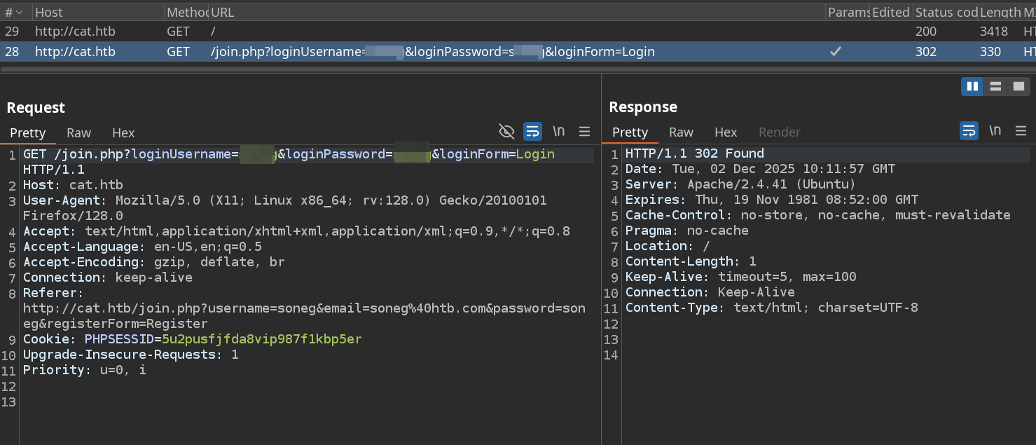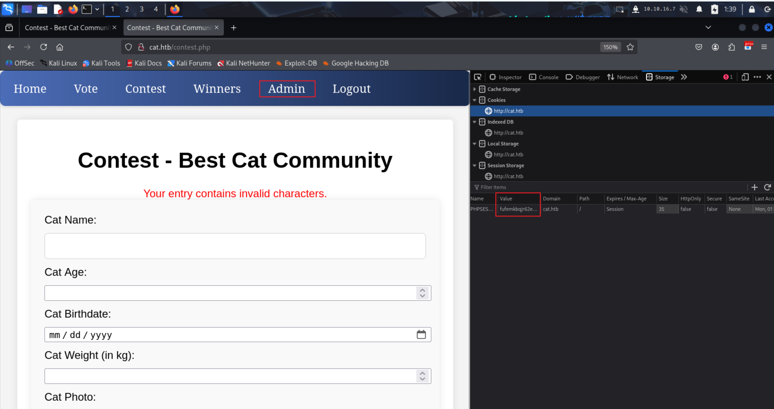 cat.htb홈페이지에 로그인하여 XSS 취약점을 트리거하여 관리자 세션 정보를 획득했다. - (3) 획득한 세션 값을 활용하여 관리자만 이용 가능한 페이지(accept_cat.php)에 접근하였고, 이 페이지에 존재하던 SQLi 취약점을 이용하여 웹 서비스 폴더 내부에 웹쉘을 업로드 했다.