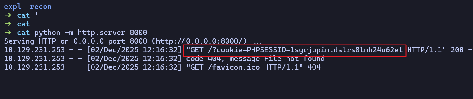- 로컬 서버를 개방한 후 기다리고 있으면 관리자가 “/view_cat.php?cat_id={내 이미지}” 경로로 접근했을 때 관리자의 세션 정보가 공격자 호스트 측으로 전달된다.