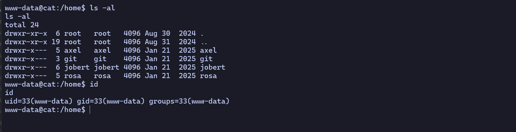 www-data로 /home 디렉토리에 접근하여 유저 플래그를 확인하는 것은 불가능했다.