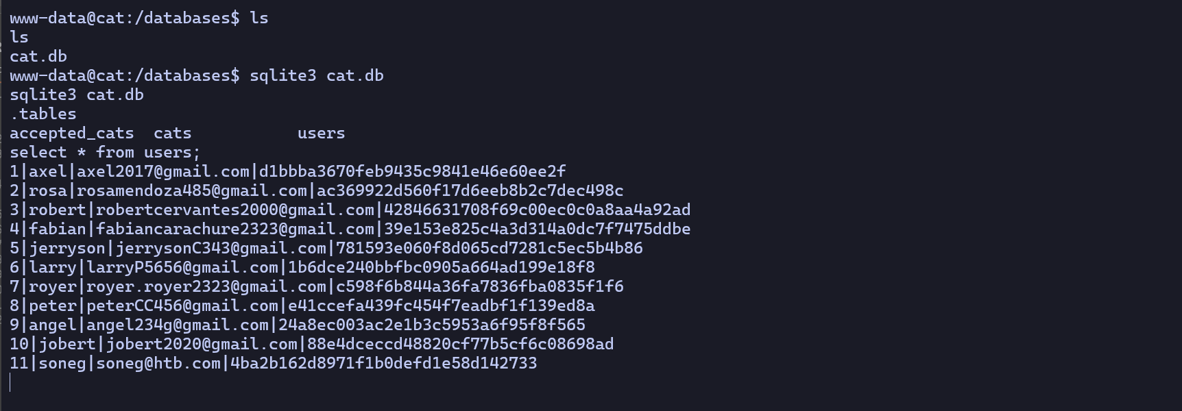 /databases/cat.db파일에 접속하여 계정 정보 획득 후 해시 크래킹을 통해 유효한 계정(rosa)을 획득했다.