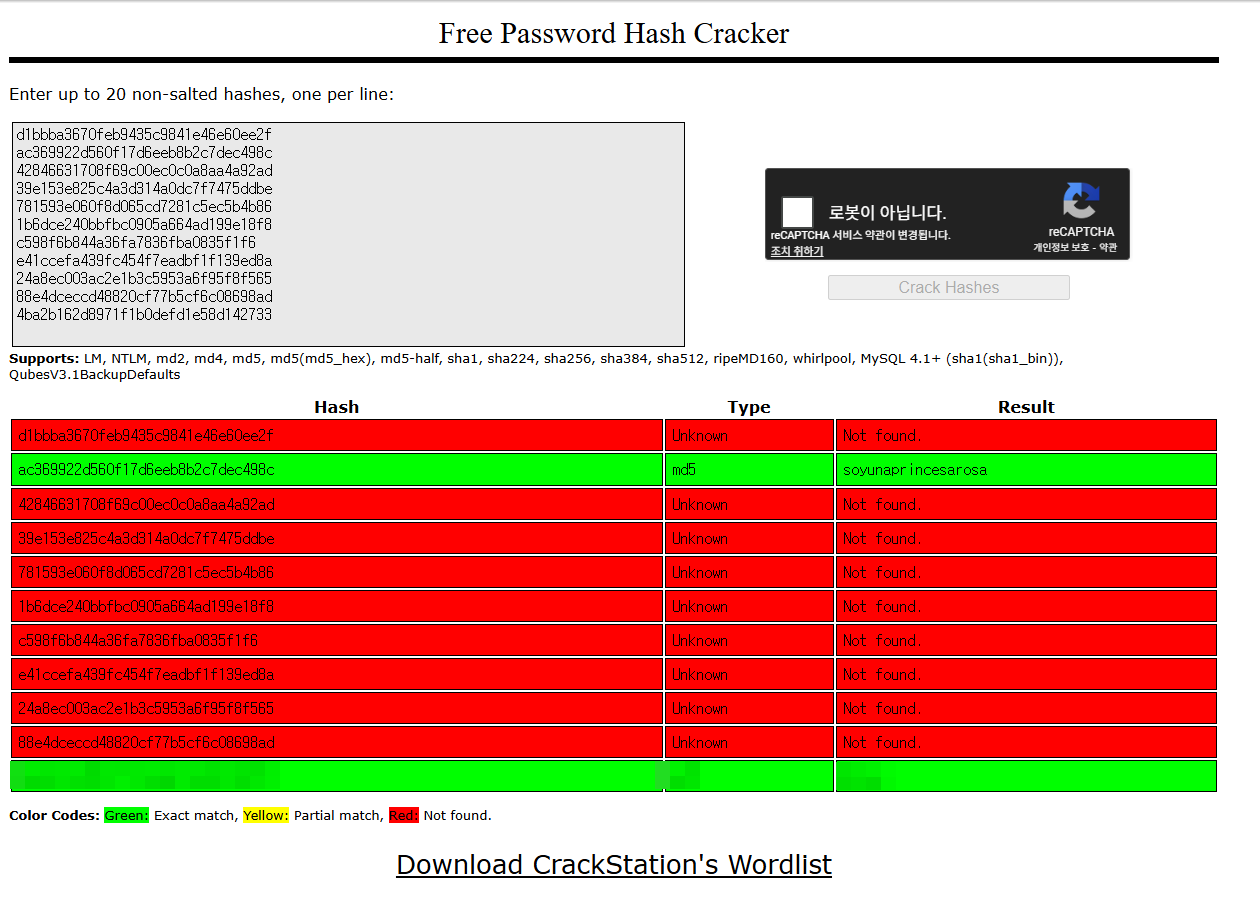 4ba2b162d8971f1b0defd1e58d142733rosa계정에 대한 평문 패스워드(soyunaprincesarosa) 획득에 성공했다.- (맨 아래는 공격자가 새로 회원가입을 한 계정이므로 제외한다.)