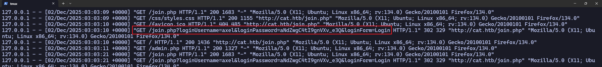 access.log파일을 뜯어보니,axel계정 회원가입 시 입력한 정보(아이디/패스워드)가 있었다.(계정정보) axel / aNdZwgC4tI9gnVXv_e3Q