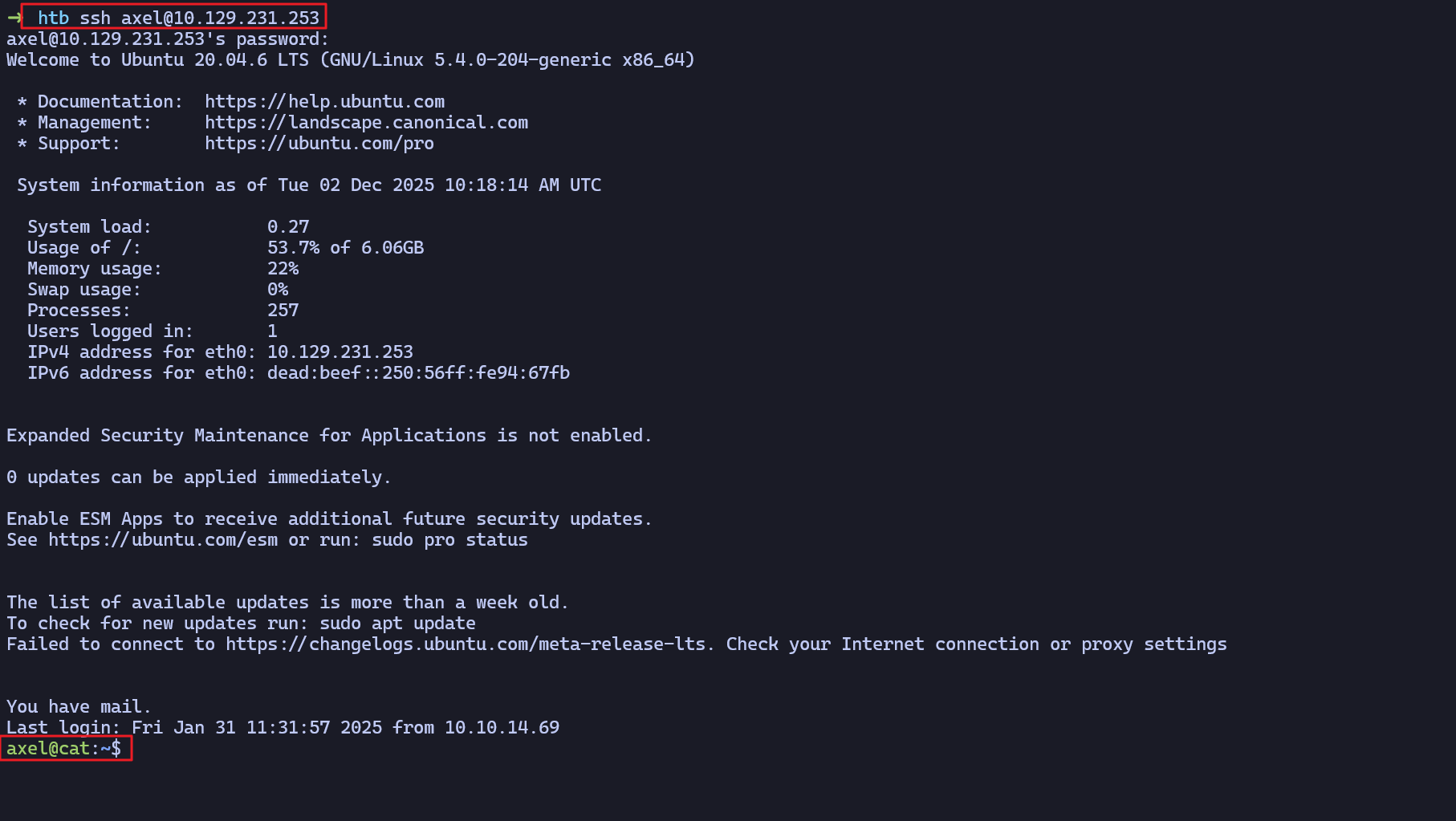 획득한 계정정보(axel)로 SSH 접속이 가능하였으며,