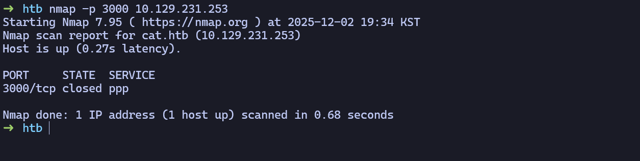 - 당연히 내부에서 운영되는 포트이므로, 외부에서는 대상 호스트의 3000번 포트는 닫혀있다고 나온다.