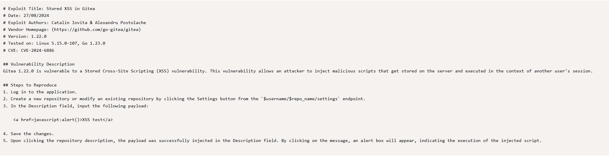 gitea 1.22.0버전에는 저장형 크로스 사이트 스크립팅 취약점이 존재했다.- CVE-2024-6886 (https://www.exploit-db.com/exploits/52077)