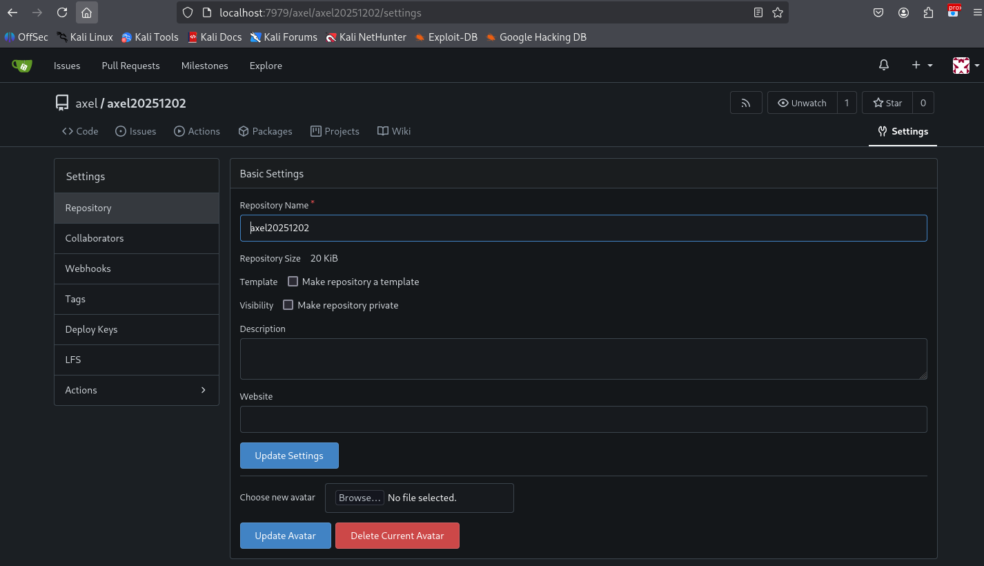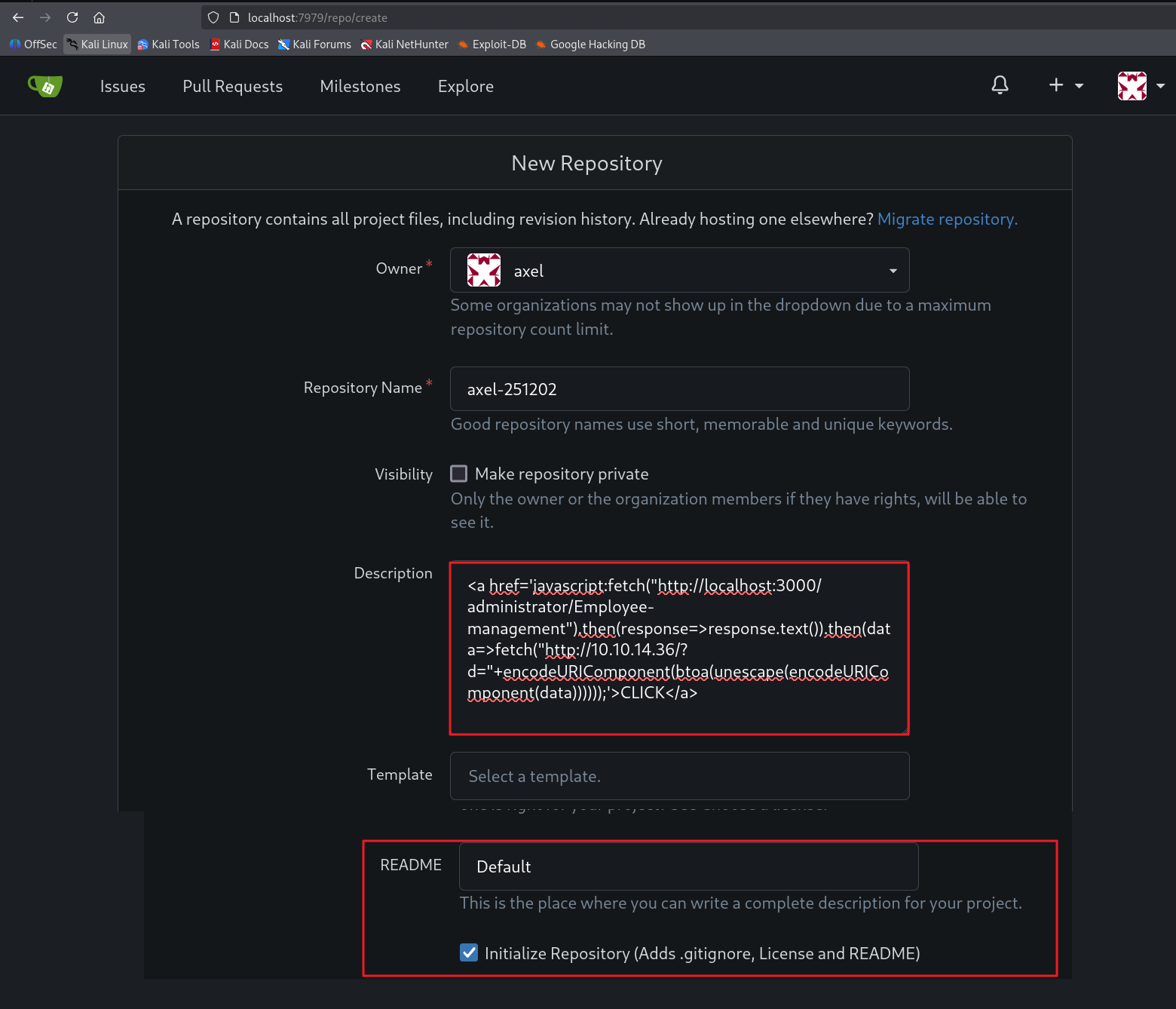 ### Post Exploit - (1) 리포지토리 생성 시 "Description" 입력란에 XSS 페이로드를 삽입한다. - 이 때, `Initialize Repository` 체크박스를 클릭하여 리포지토리 초기화를 반드시 해야 한다. ``` CLICK ``` ![[C9X8S7D6A5ST6WA9-bf8ds68b96db789sdb78-20251202223023796.png]]
