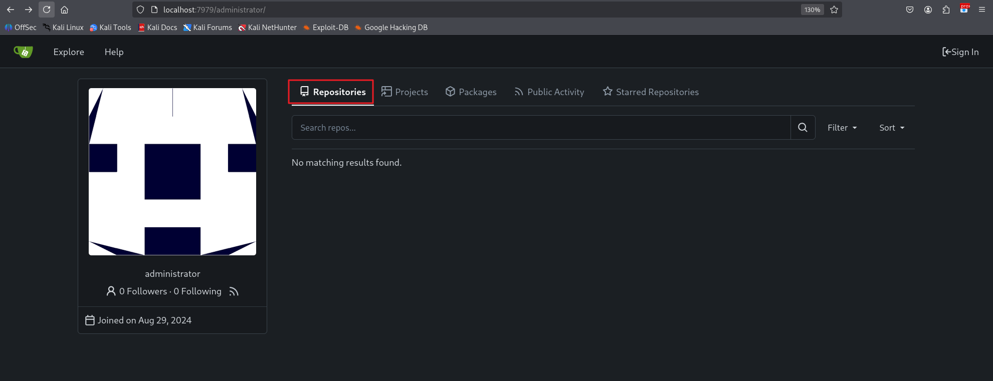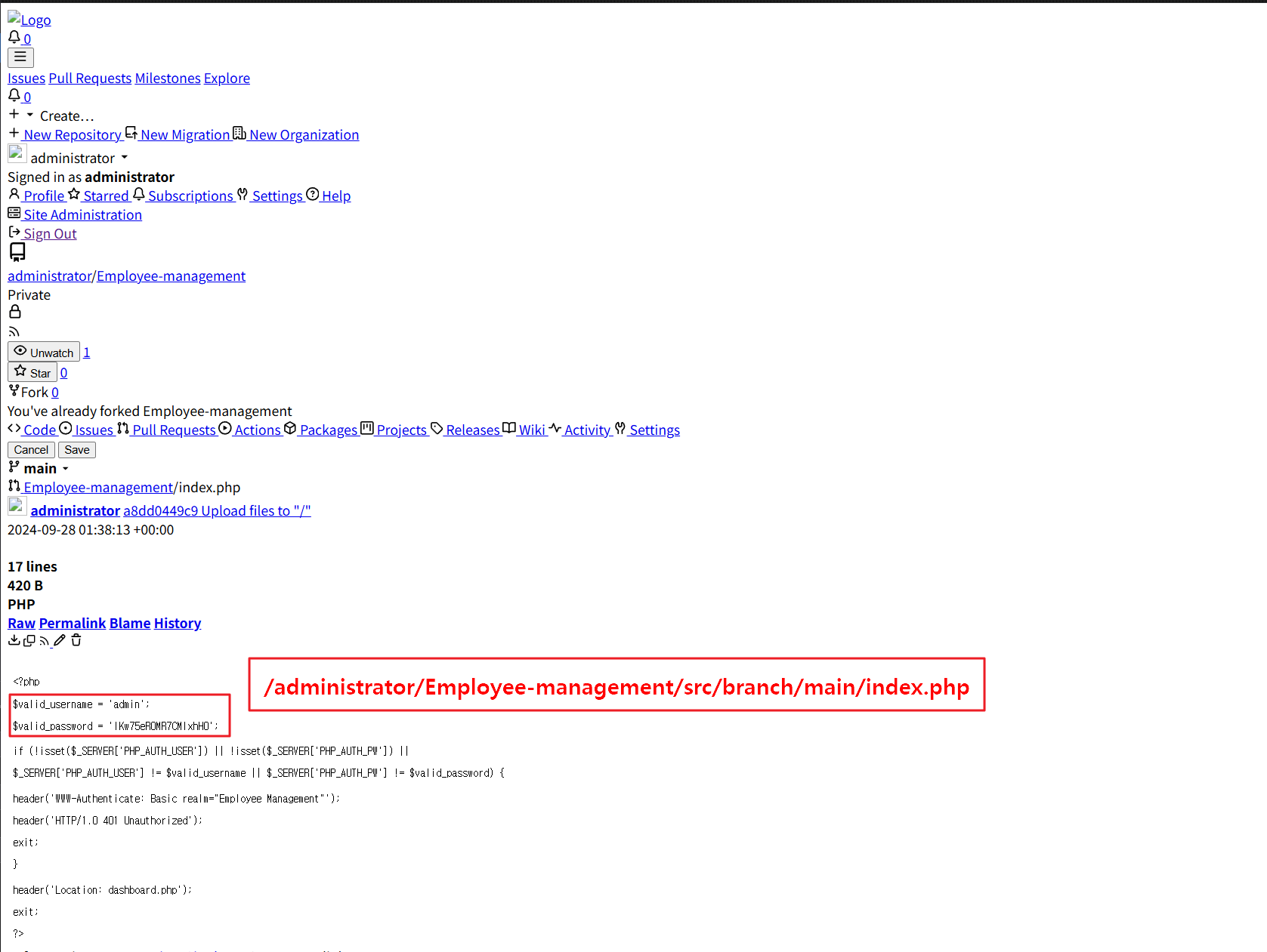 - /administrator 유저의 리포지토리로 접근해봤으나, 확인 가능한 정보는 없었다.
