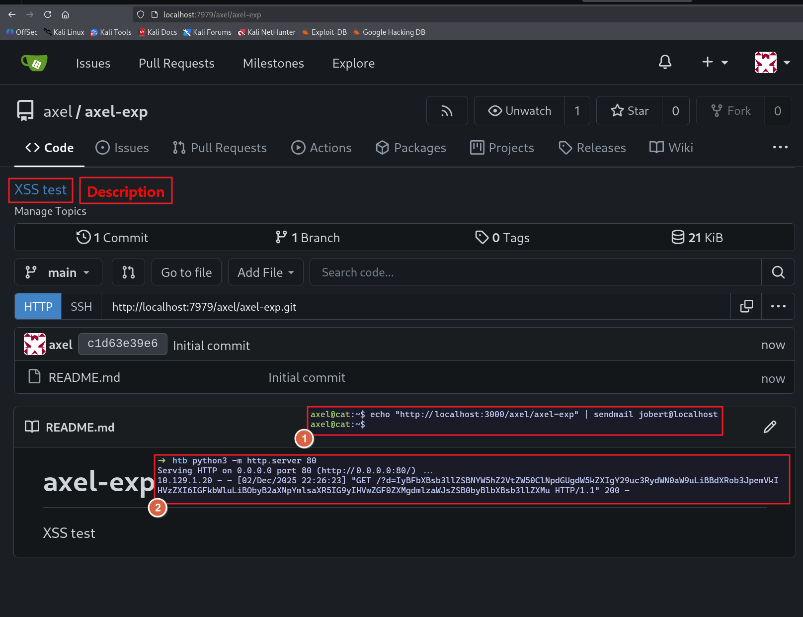 jobert에게 XSS 페이로드가 저장된 URL 경로를 메일로 전달 → 희생자가 해당 URL을 클릭 → Description 에 삽입된 XSS 페이로드 실행 → 공격자에게 README.md 정보 전달)- 여기서