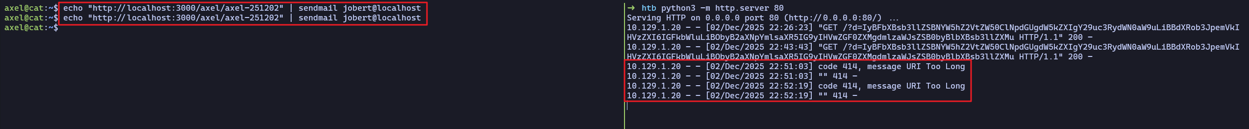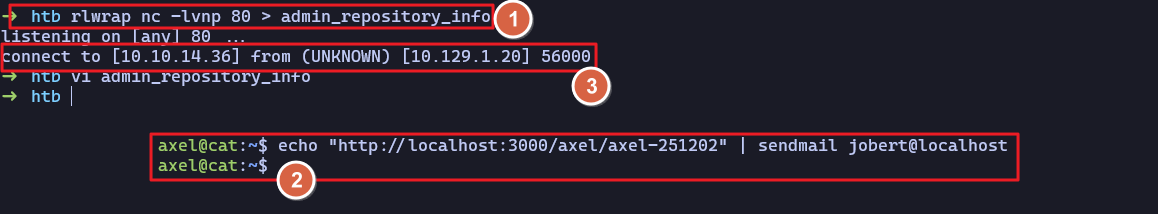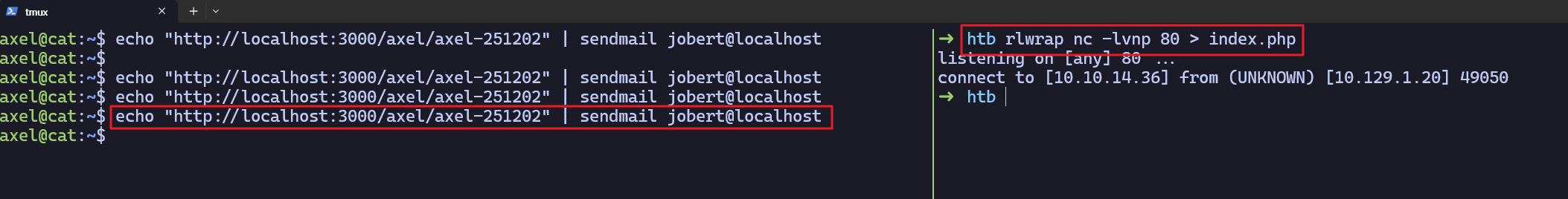 sendmail을 통해jobert에게 이메일을 전송하고 공격자 호스트로 전달된 값을 확인한다.- (리스닝 포트를 열어둔 후 조금 기다리면 공격자 호스트로 값이 전달된다.)