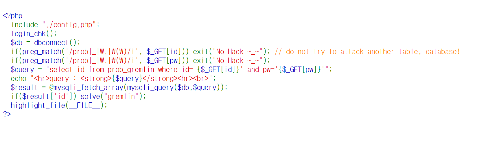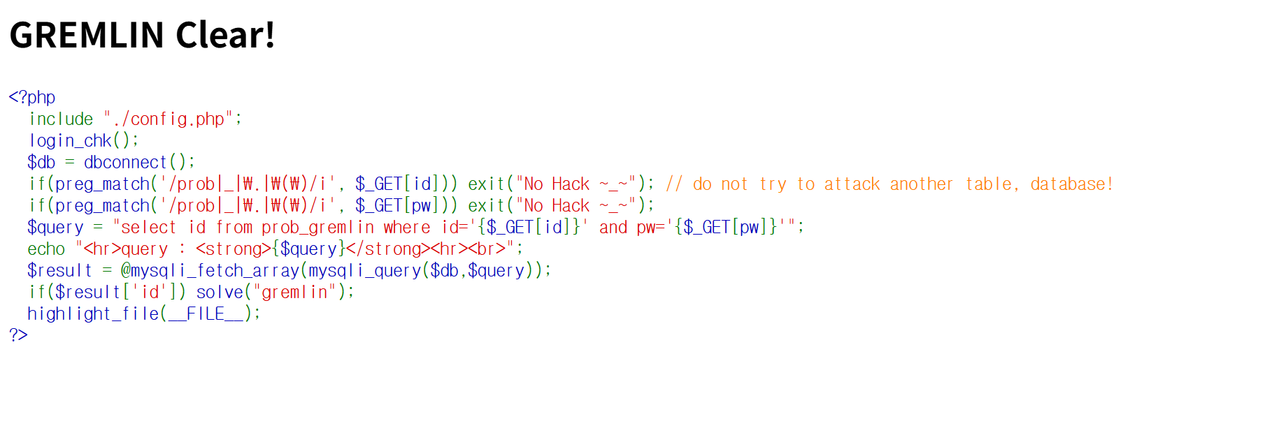 if($result['id']) 값이 참(true) 이므로 sovle("gremlin") 함수 실행되며 “GREMLIN Clear!” 메시지가 출력된다.