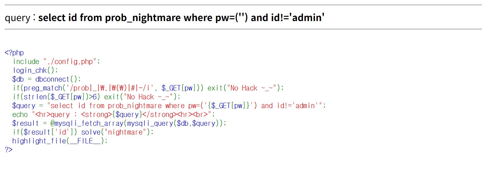 이번 문제의 포인트는 pw=('{$_GET[pw]}') 부분에 임의의 페이로드를 삽입하여 $result['id'] 값이 존재하도록 유도하는 부분이다.