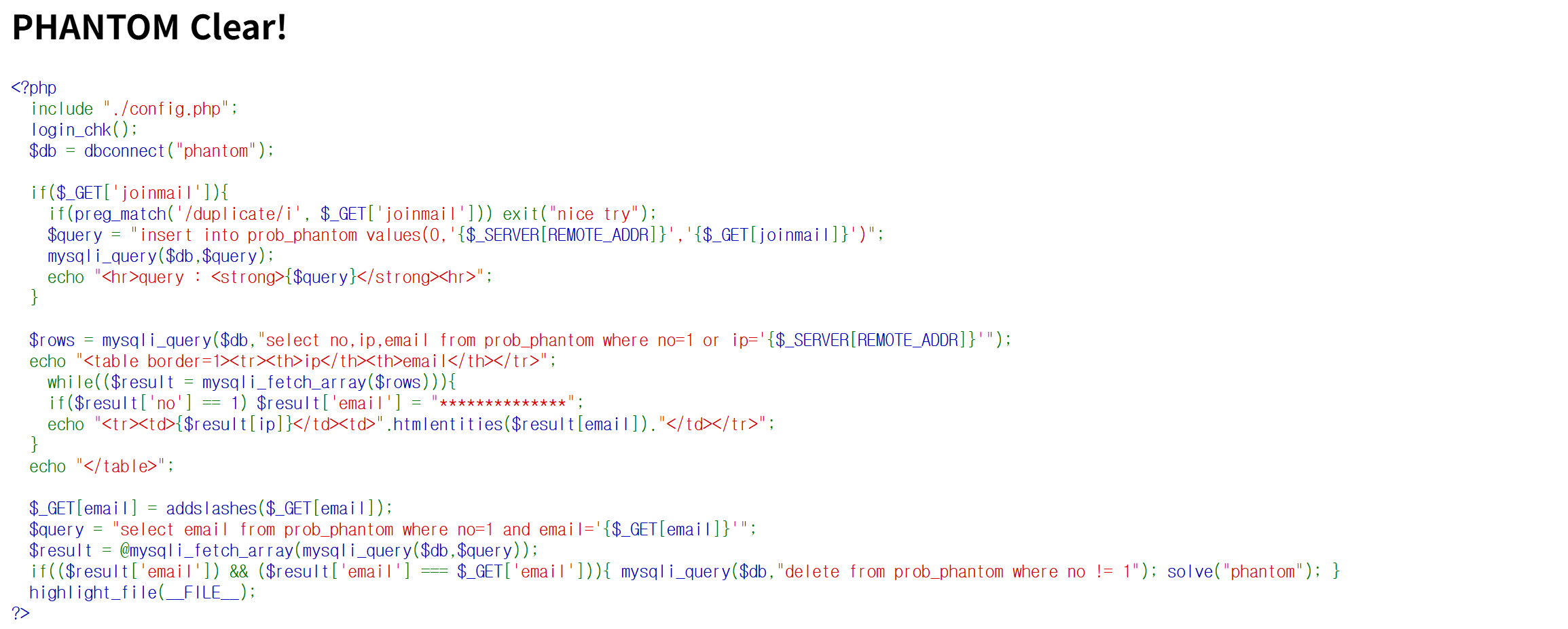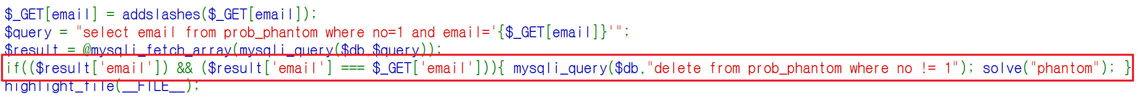 $query = "select email from prob_phantom where no=1 and email='{$_GET[email]}'";