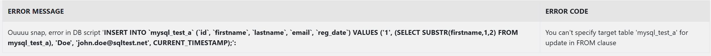 - 만약 자기 자신의 테이블에서 값을 가져와 데이터를 추가/변경할 때 별칭을 설정해주지 않으면 아래 오류가 발생하지만