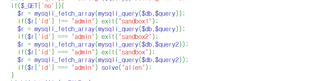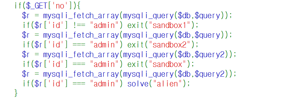 때문에, 2번째 조건인 if($r['id'] === "admin") 를 통과하지 못하고 sandbox2 응답이 브라우저에 출력된다.