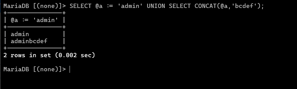 # query2 → ' UNION SELECT CHAR(97,100,109,105,110)#' UNION SELECT CHAR(97,100,109,105,110)#'