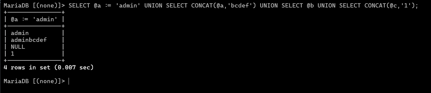 ( 앞선 쿼리와 조금 달라졌는데 query2 절에서 UNION 절로 바로 admin 행을 가져와서 행 순서가 admin,0,1 이 돼버렸다. )