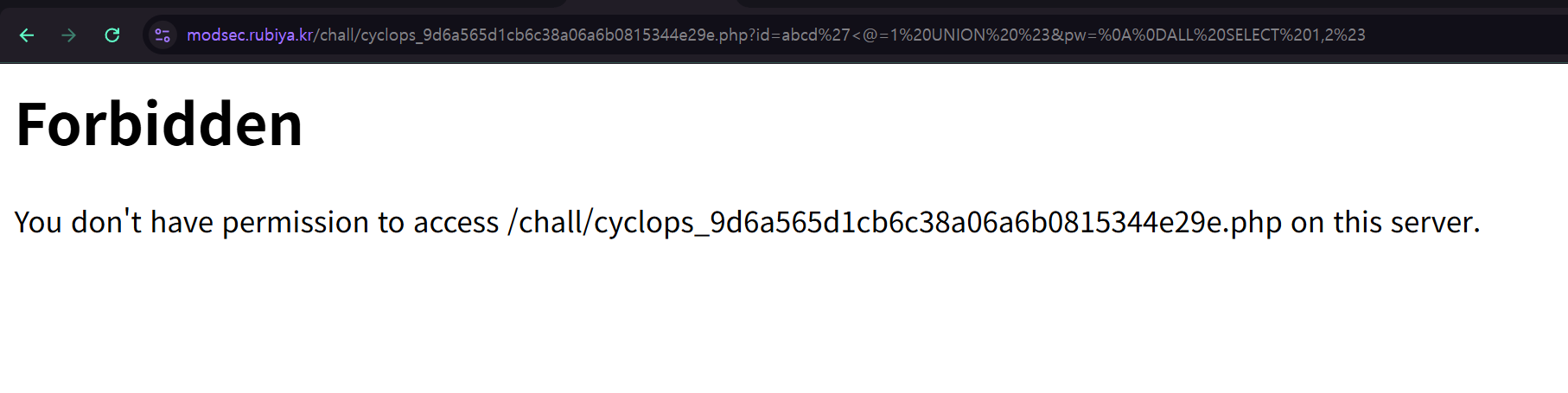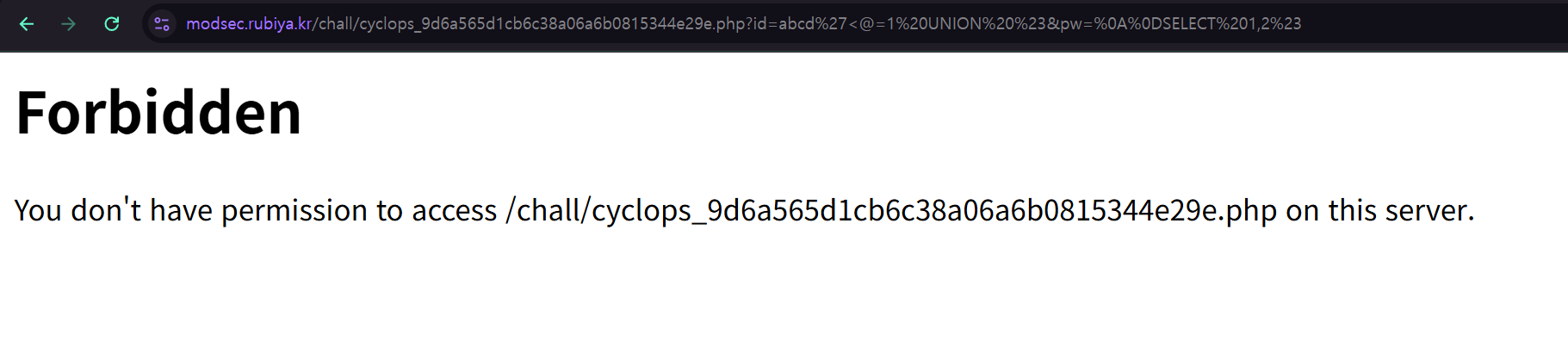 계속 WAF를 우회하는 문제가 이어진다. 바로 UNION SELECT 절을 이용하면 WAF에 의해 차단된다.