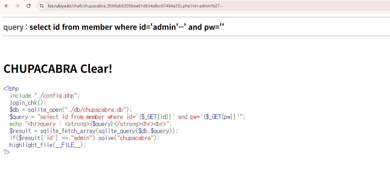 이번 문제는 id 파라미터에 SQL 인젝션을 수행하여 $result['id'] == "admin" 이 되도록 유도하는 문제였다.